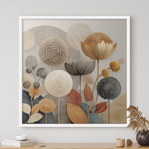 Abstrakcyjna roślina o czerwonych liściach na tle geometrycznych kształtów i delikatnych, stonowanych kolorów