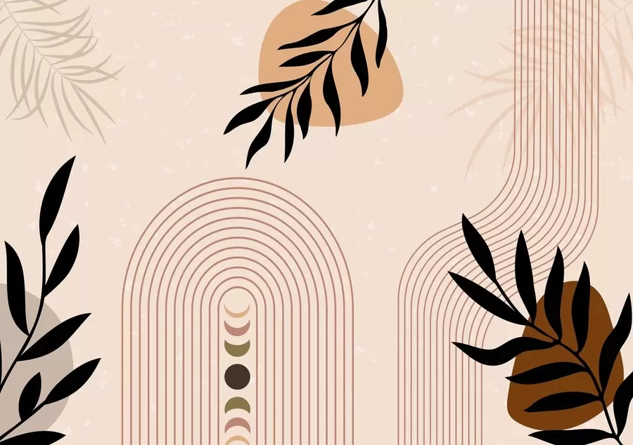 Abstrakcyjna nowoczesność, minimalizm, boho, geometria, plamy akwarelowe, pełnia księżyca, sylwetka liścia palmowego, topografia, zawiłość, pomarańczowy, żółty, szary