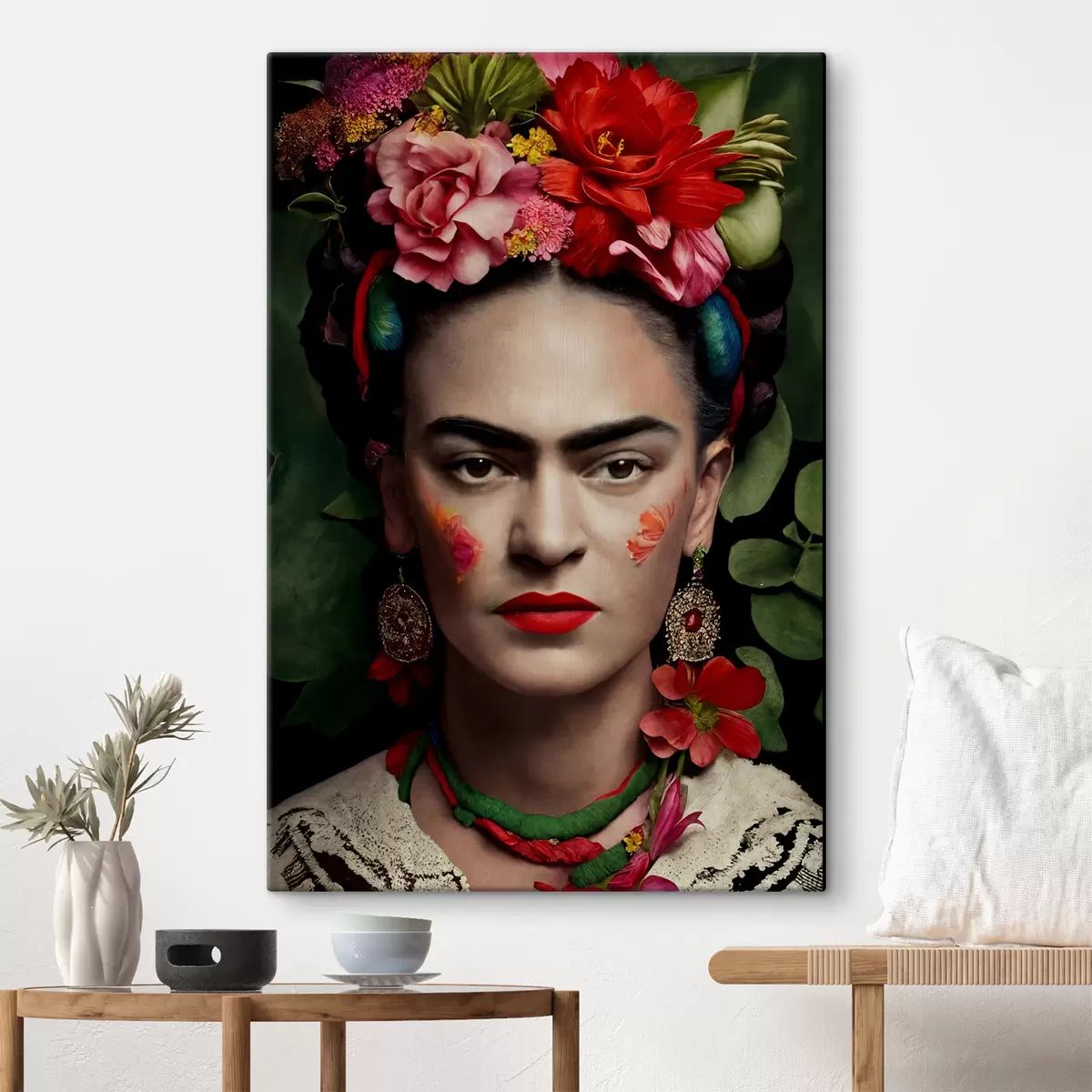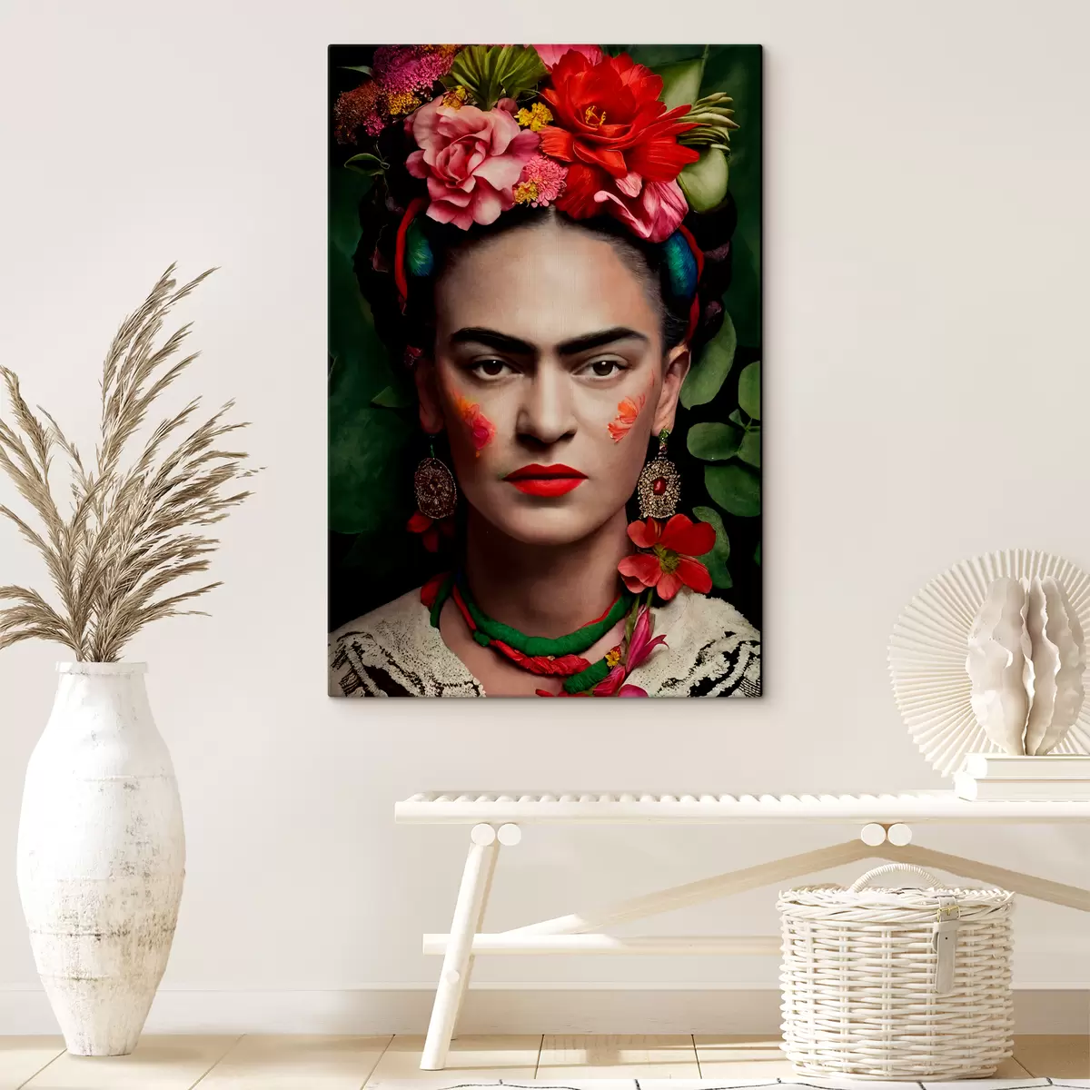 Obraz Frida Kahlo z kwiatami na zielonym tle s32861