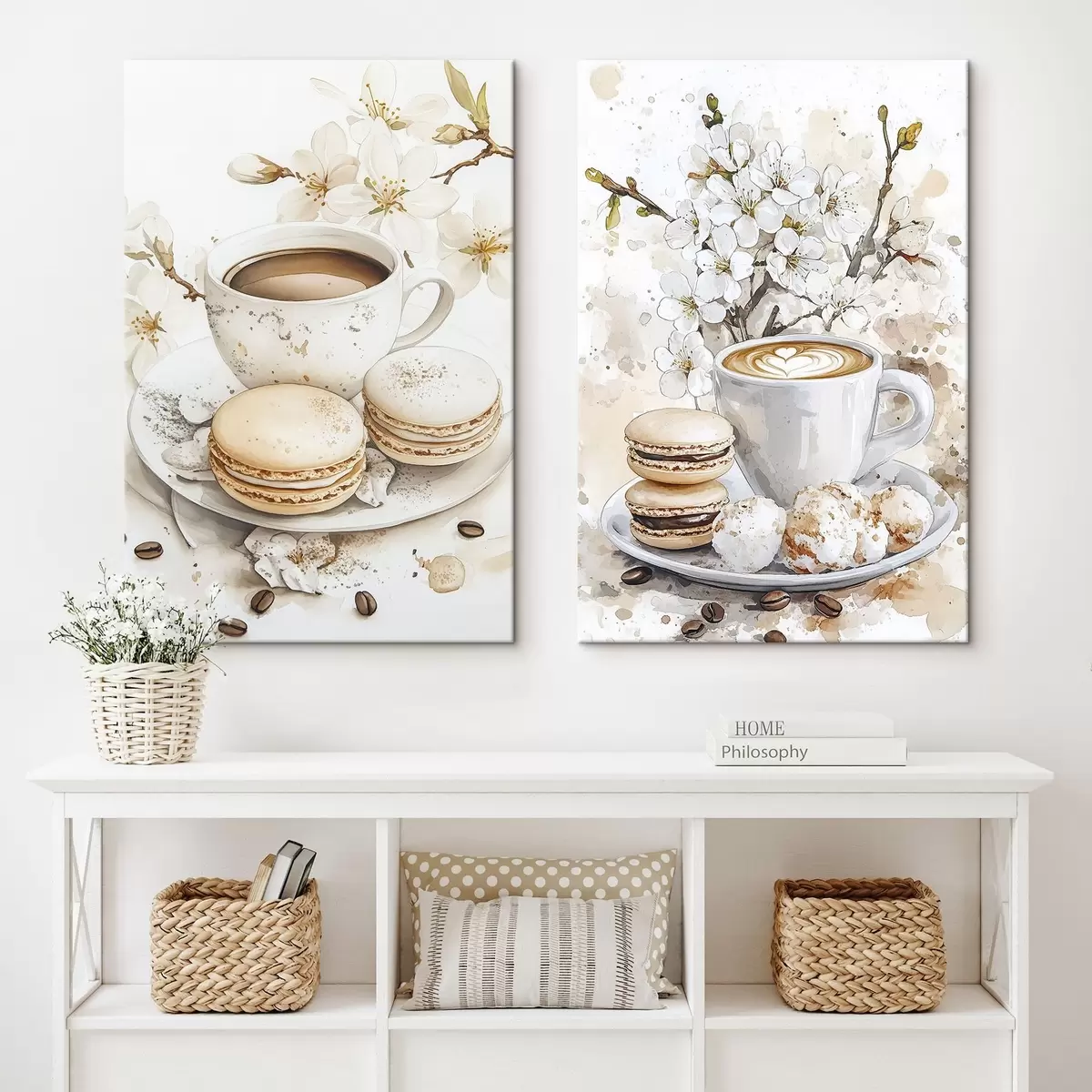 Obraz Filiżanka kawy z makaronikami, kwiaty jaśminu, styl akwareli, ziarna kawy, beżowe kolory Nr m00387