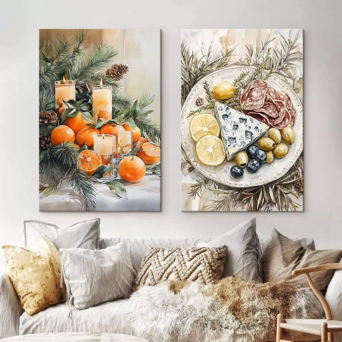 Obraz Świąteczny wystrój z pomarańczami, świecami i sosnami, jedzenie w stylu akwareli, niebieski ser, salami, oliwki Nr m00389