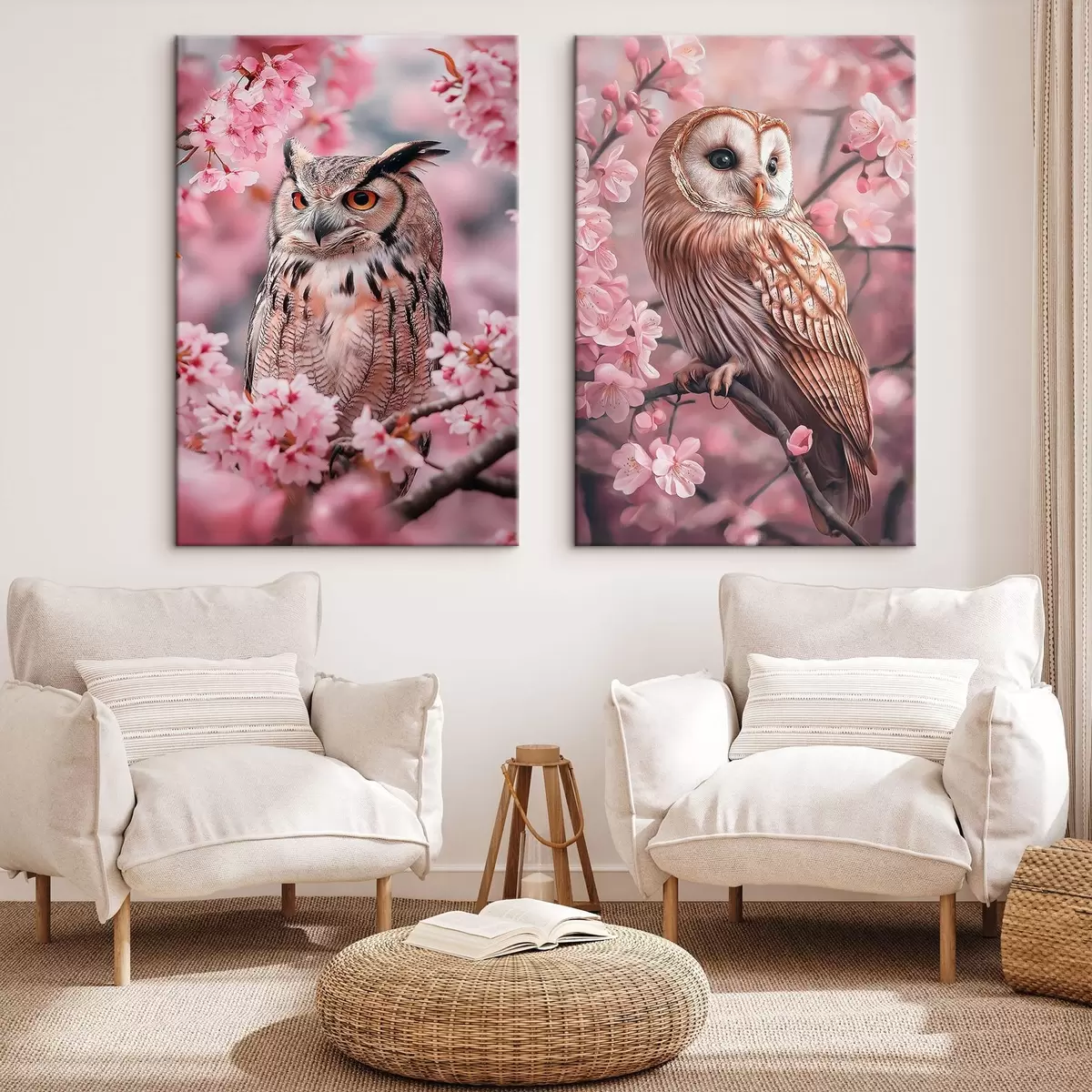Obraz Sowy na wiśni, różowe kwiaty, realizm, natura Nr m00411