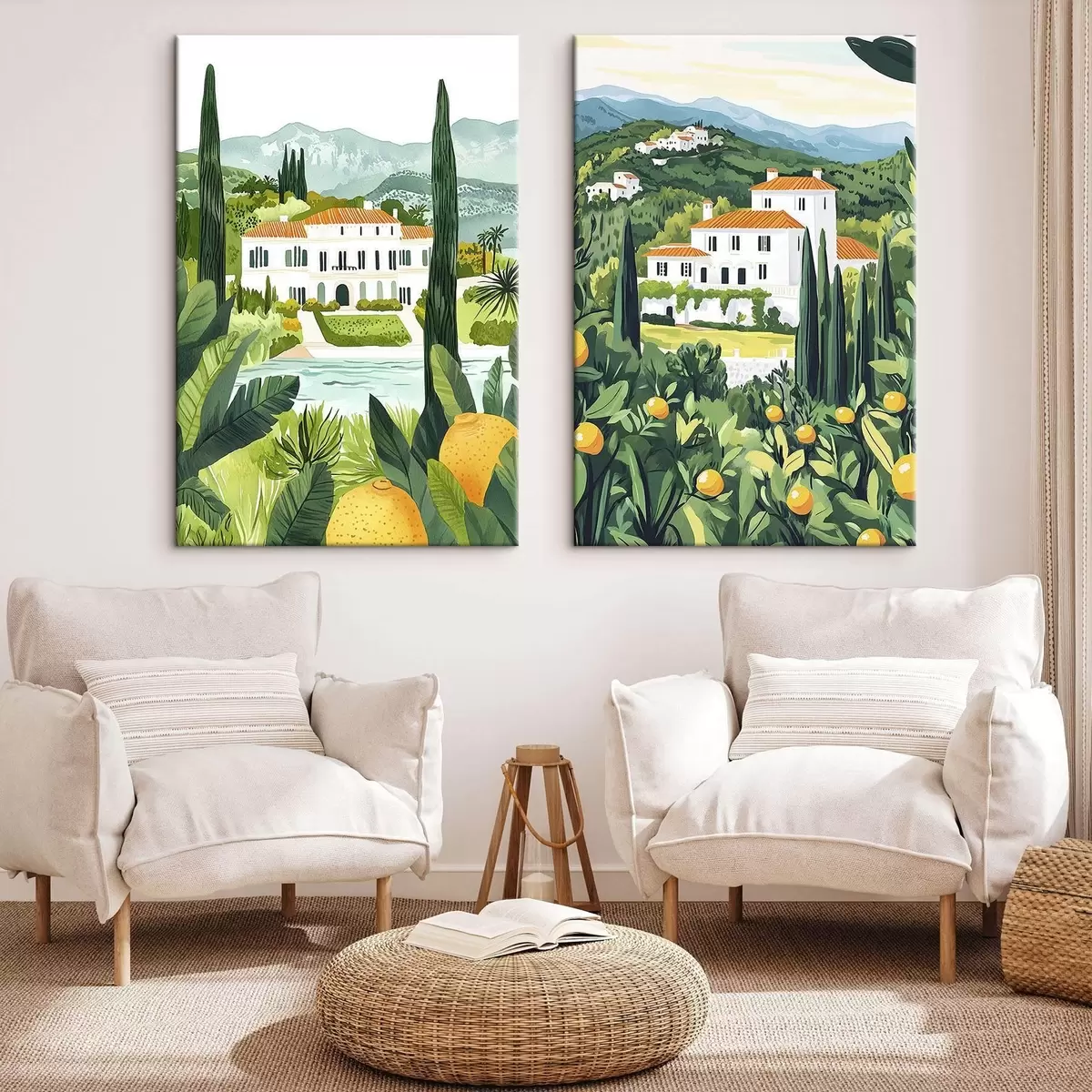 Obraz Śródziemnomorskie krajobrazy z drzewami i domami, wybrzeże morskie, Hiszpania Nr m00450