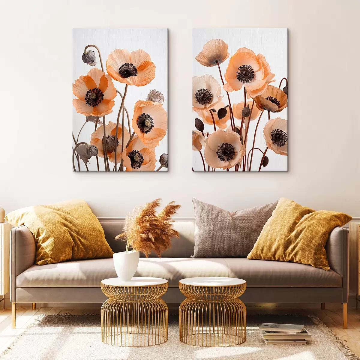 Obraz Pomarańczowe maki, suszone kwiaty na jasnym tle, miękkie oświetlenie, delikatne płatki, kompozycja kwiatowa Nr m00518