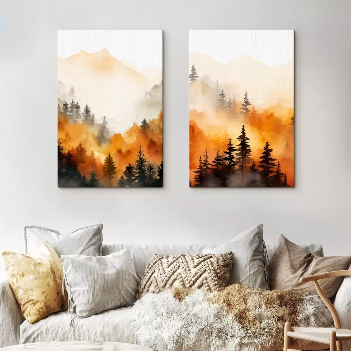 Obraz Pejzaż akwarelowy imitujący las z wysokimi sosnami i górami w tle Nr m00519