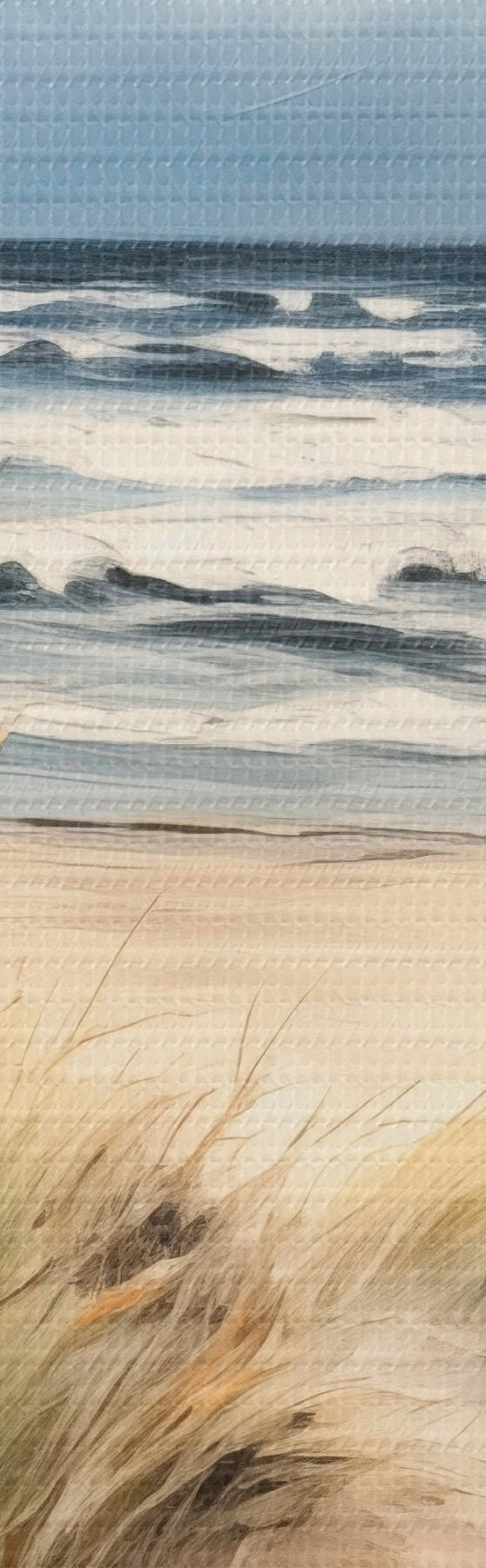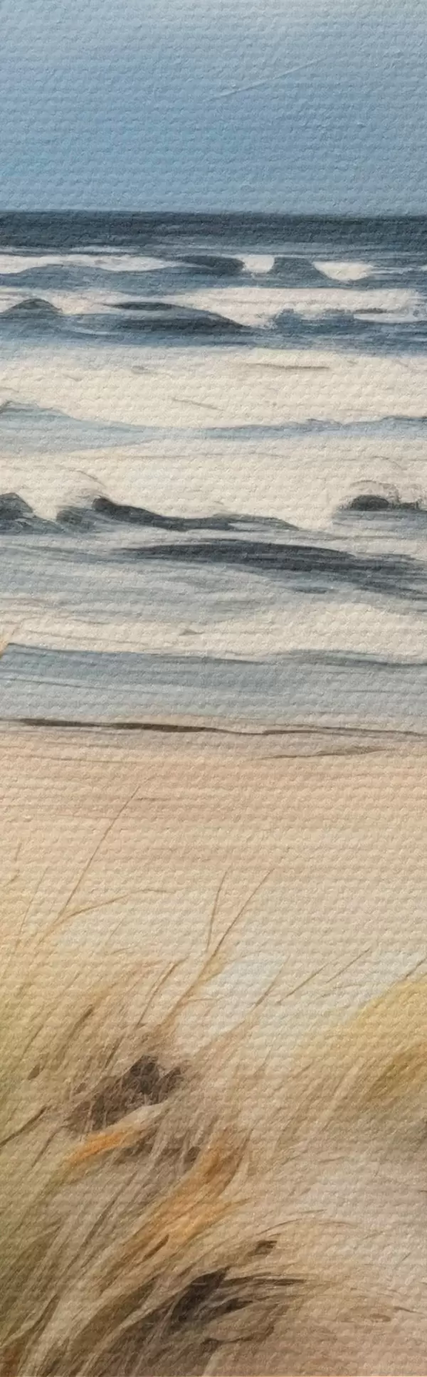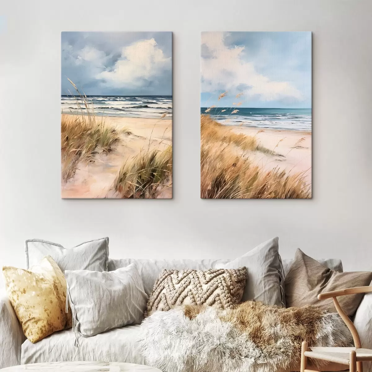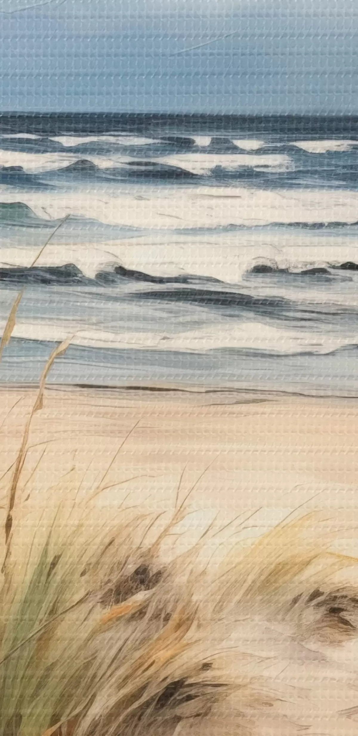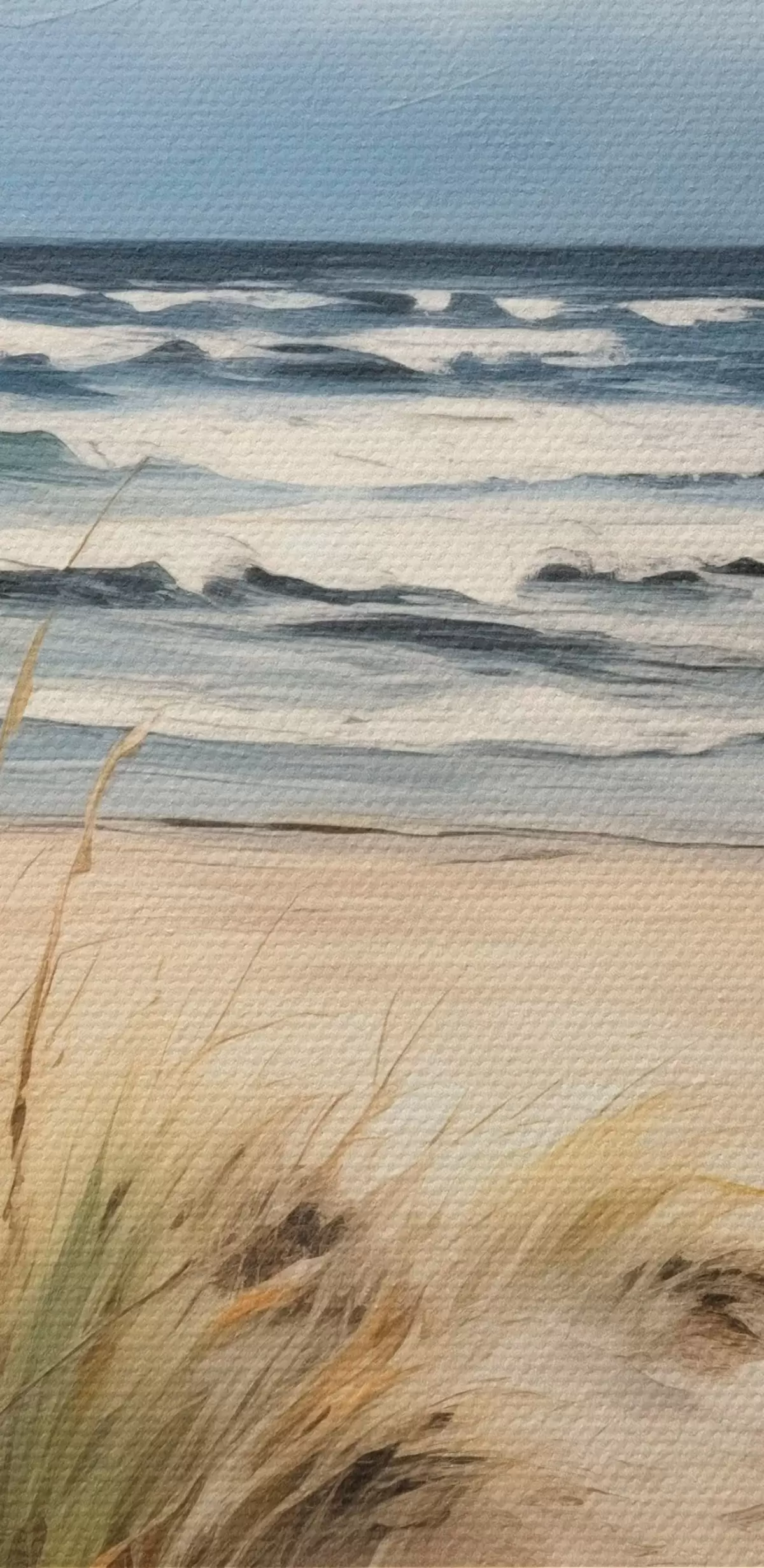 Obraz Piaszczysta plaża z wysoką trawą na pierwszym planie, ocean z falami i zachmurzone niebo w tle Nr m00521