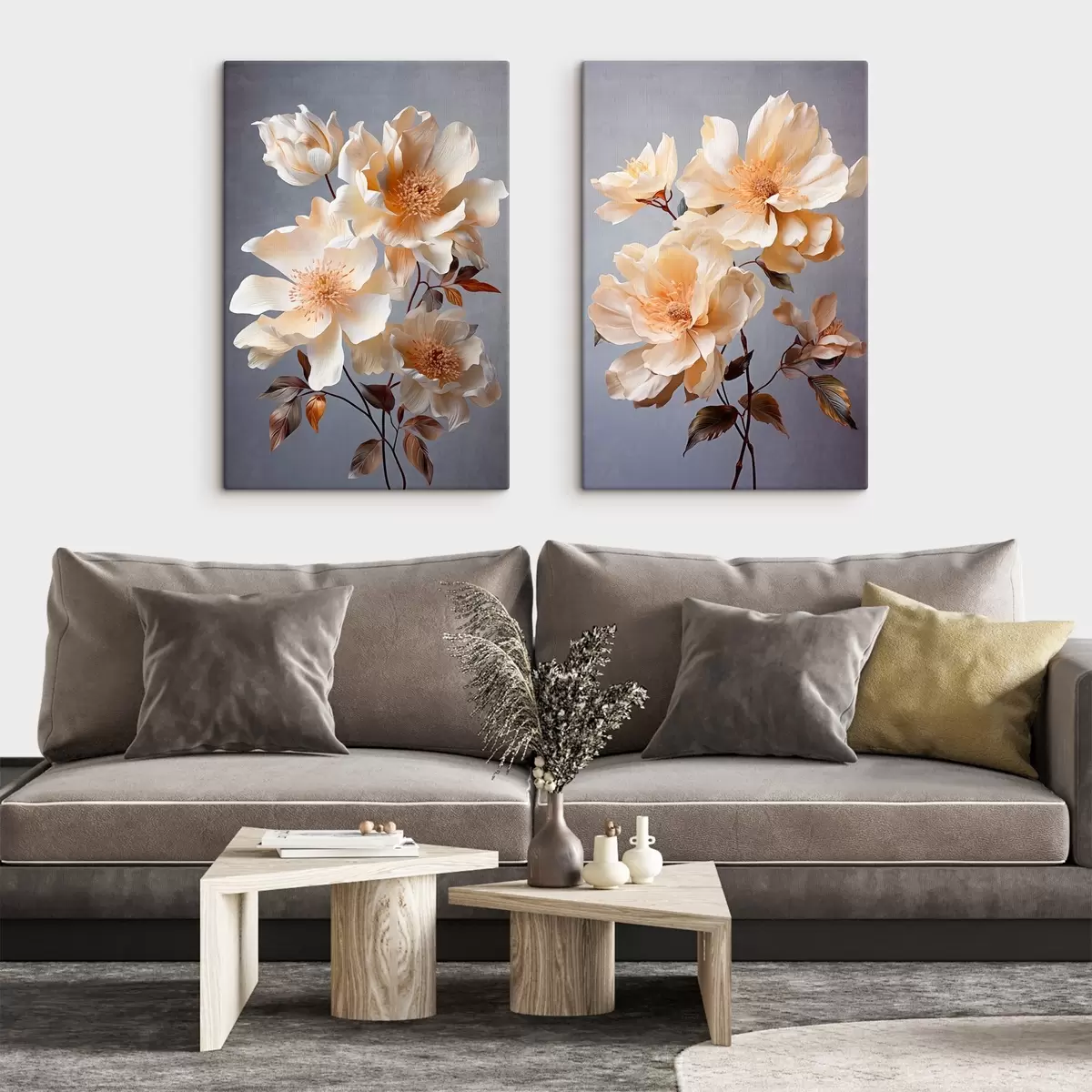Obraz Teksturowane kwiaty z pomarańczowymi słupkami i pomarańczowymi liśćmi na szarym tle, miękkie światło, eleganckie, szczegółowe, realistyczne Nr m00525