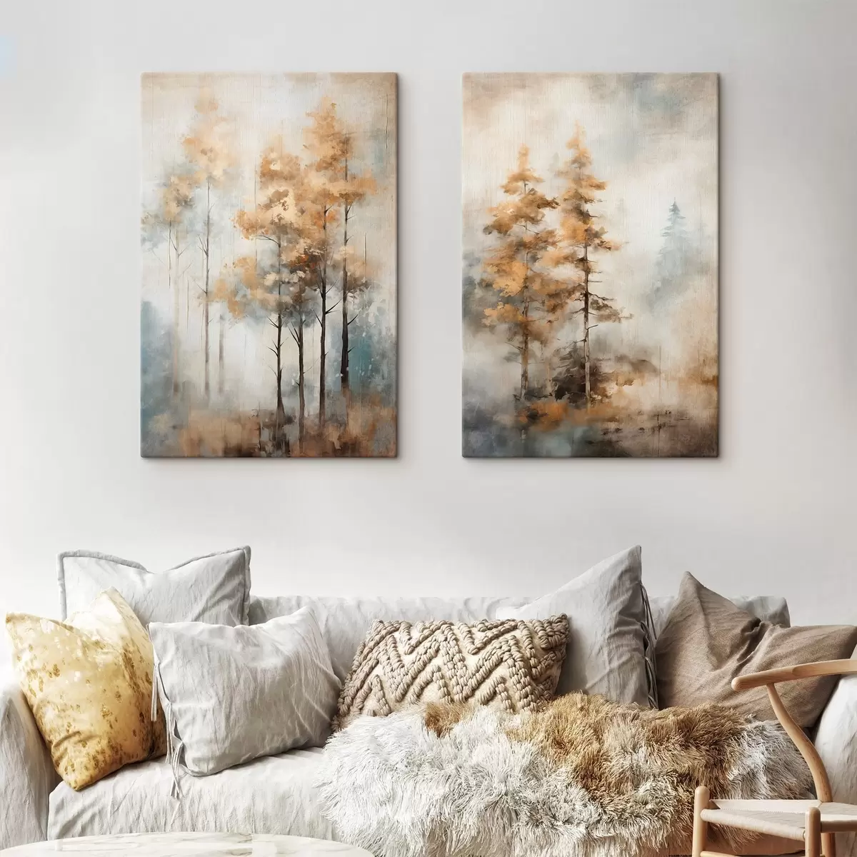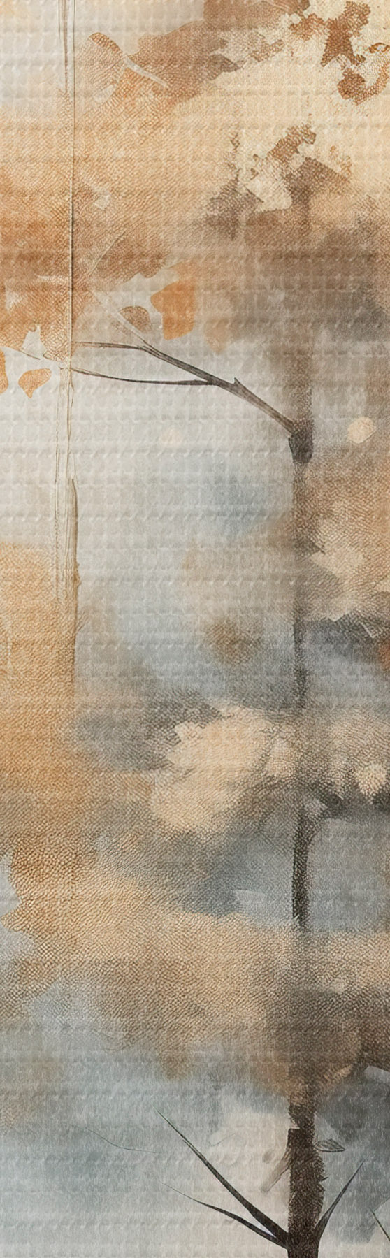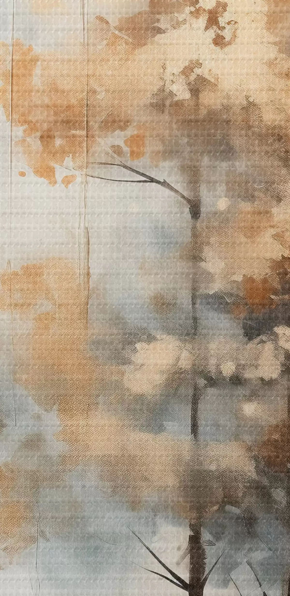 Obraz Teksturowane wysokie drzewa z żółtymi liśćmi w lesie, tło jest mieszanką delikatnych niebieskich i brązowych odcieni Nr m00528