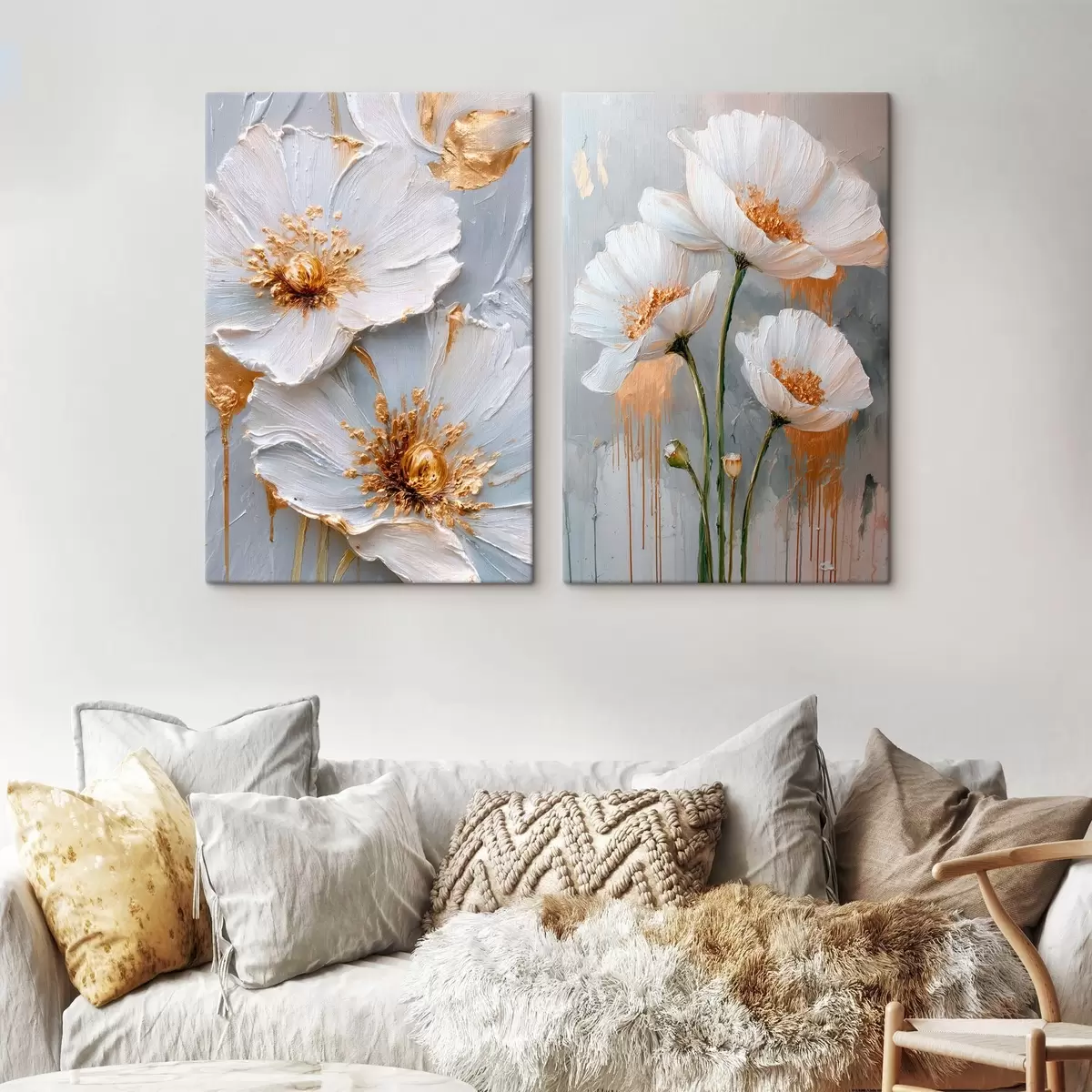 Obraz Wolumetryczny obraz białych kwiatów z żółtymi akcentami na szarym tle Nr m00568