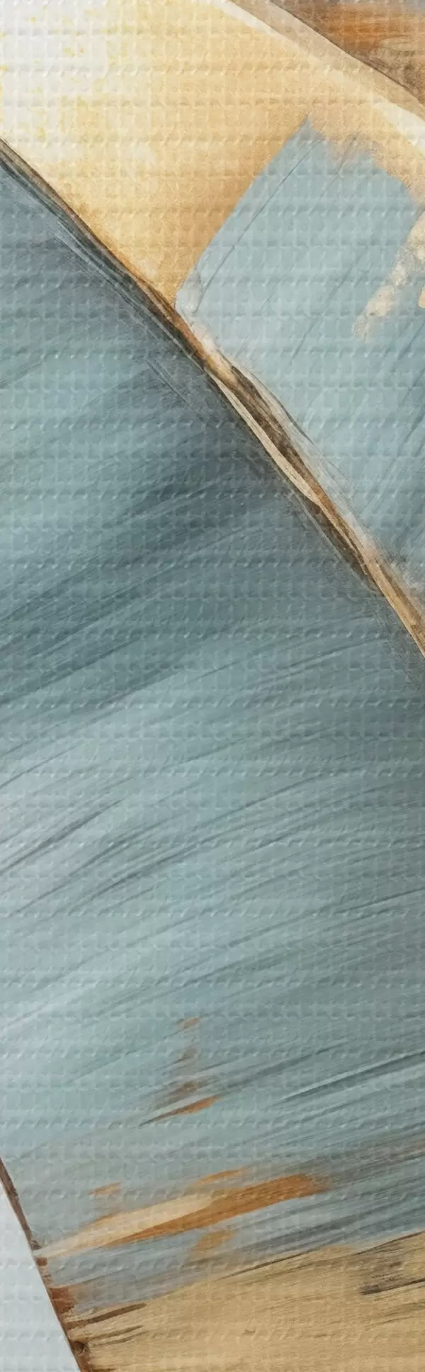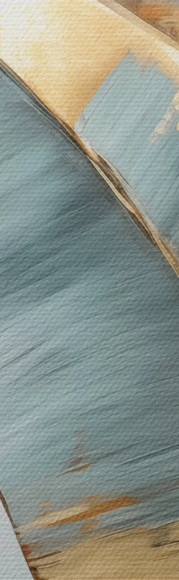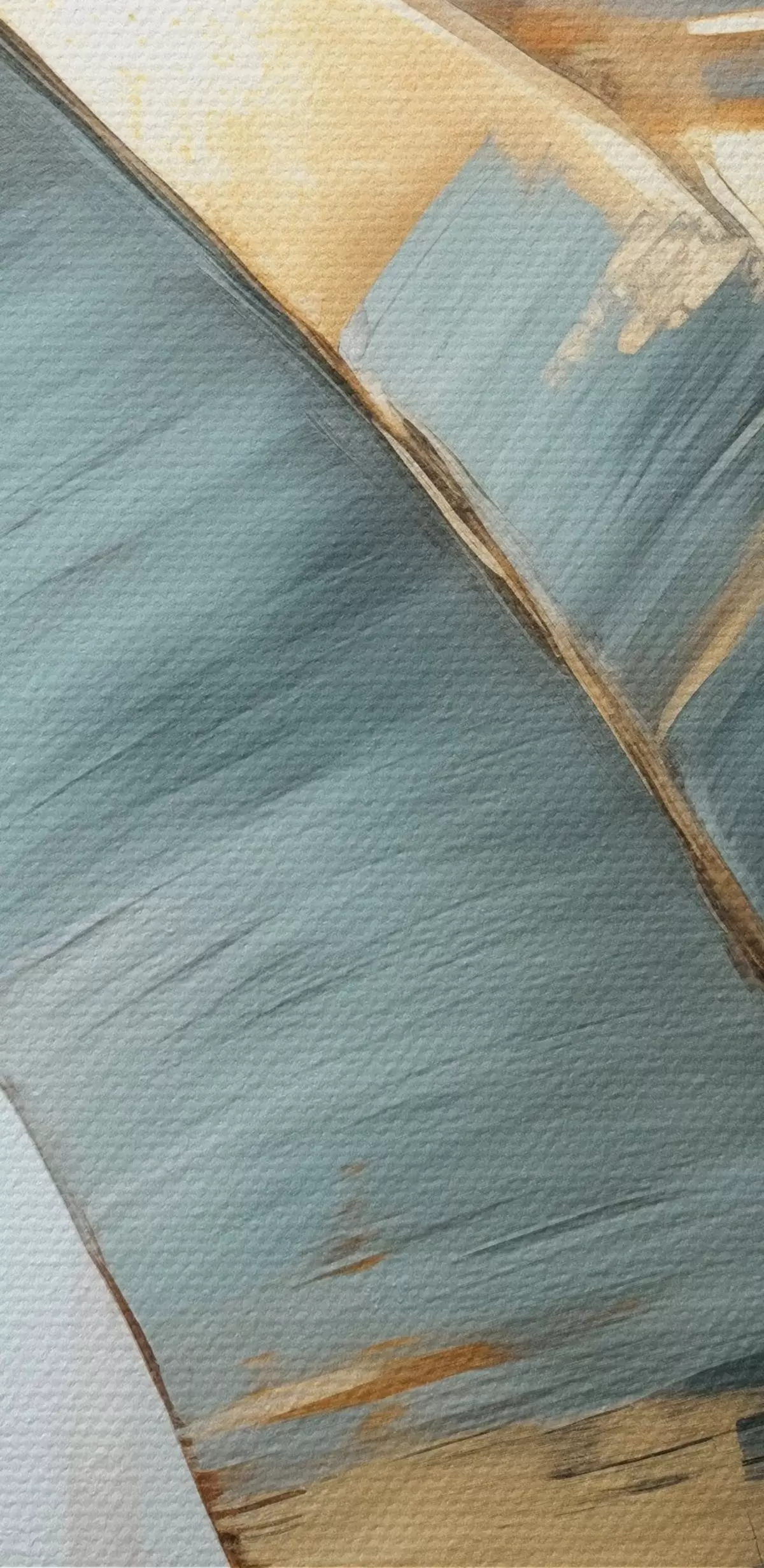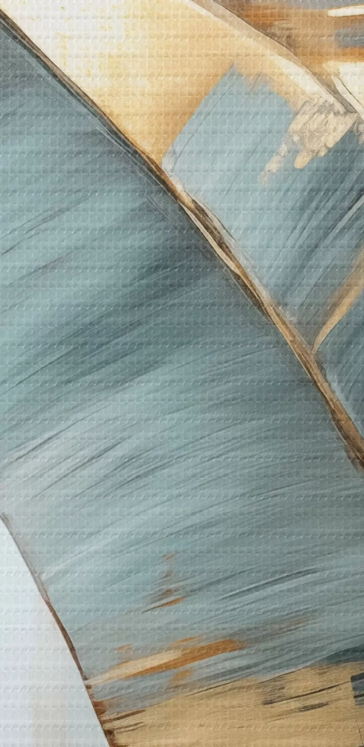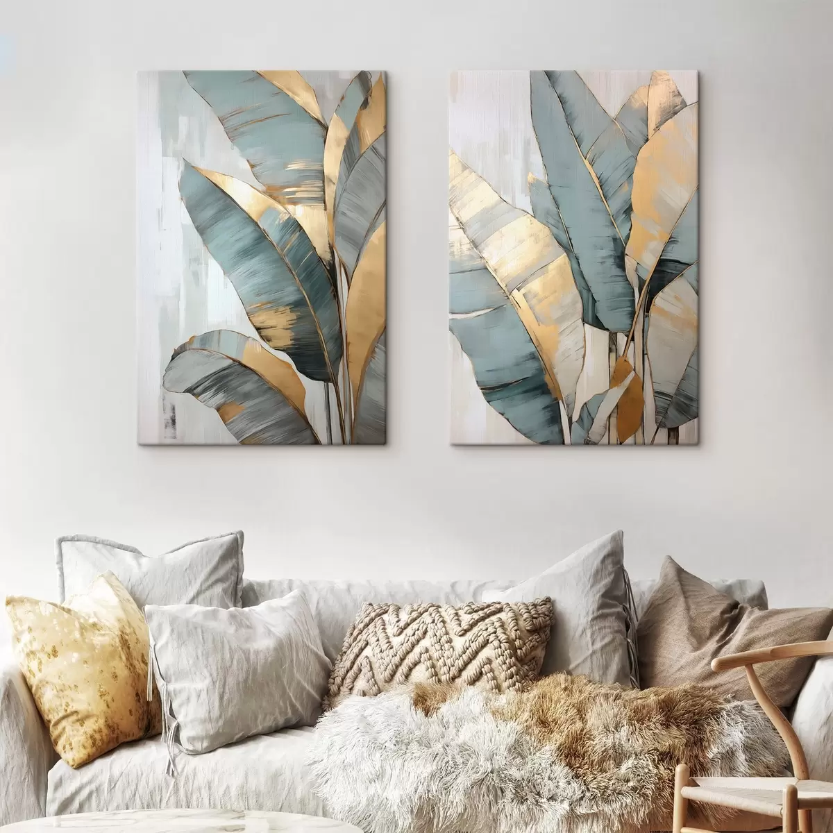 Obraz Zestaw stonowanych niebieskich, szarych i żółtych liści bananowca z widocznymi pociągnięciami pędzla na białym abstrakcyjnym tle Nr m00645