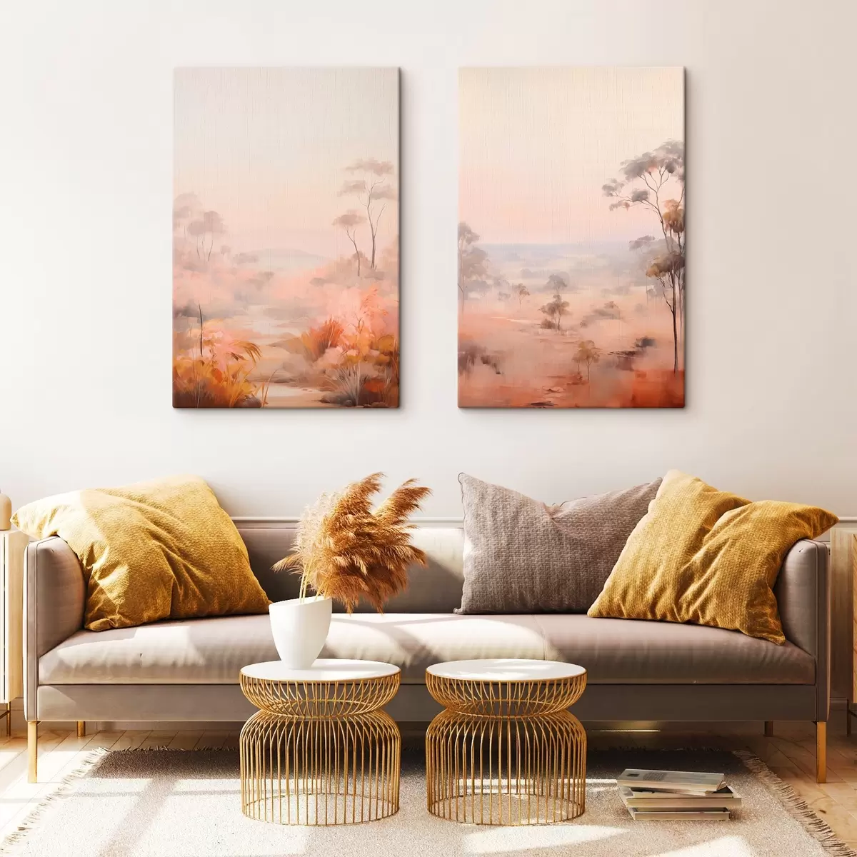 Obraz Krajobraz z krzewami i drzewami w odcieniach różu, pomarańczy i brązu, z górami w tle Nr m00646
