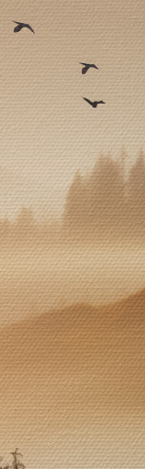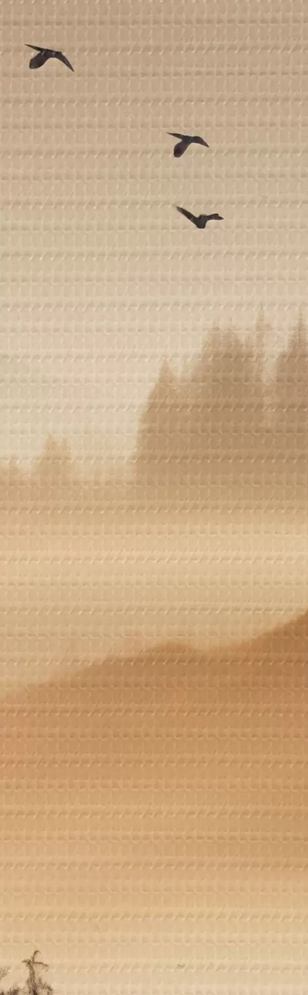 Obraz Górski krajobraz z lasem i ptakami latającymi na niebie, wszystko pokryte grubą warstwą mgły podczas wschodu słońca Nr m00651