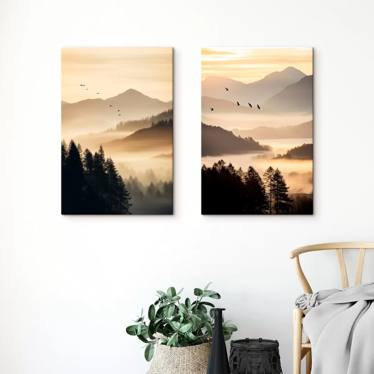 Obraz Górski krajobraz z lasem i ptakami latającymi na niebie, wszystko pokryte grubą warstwą mgły podczas wschodu słońca Nr m00651