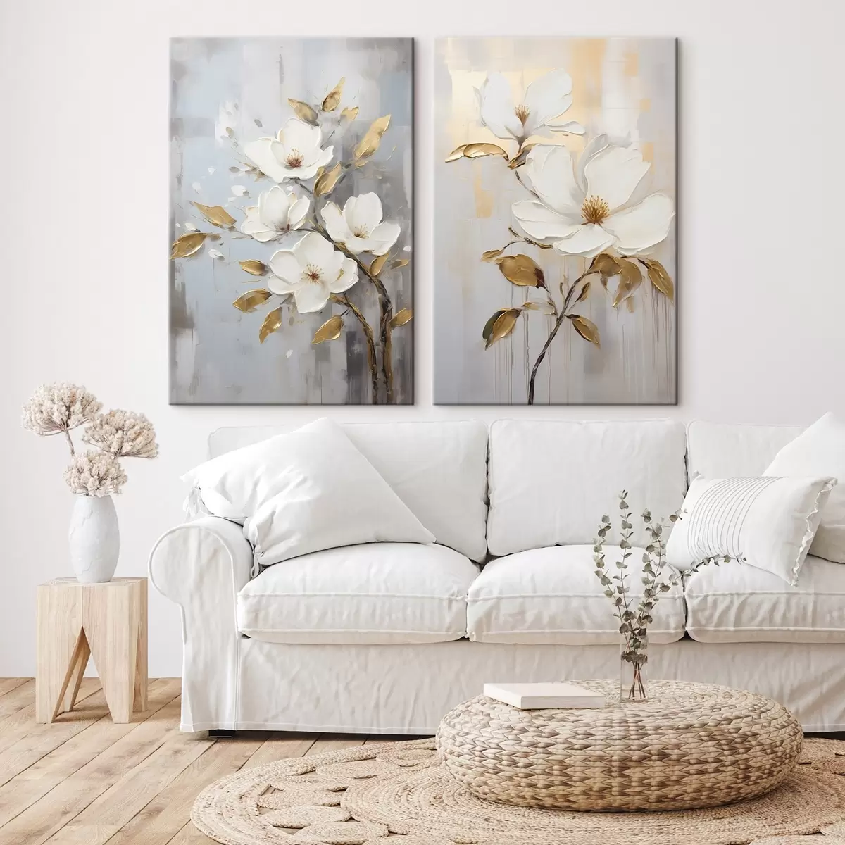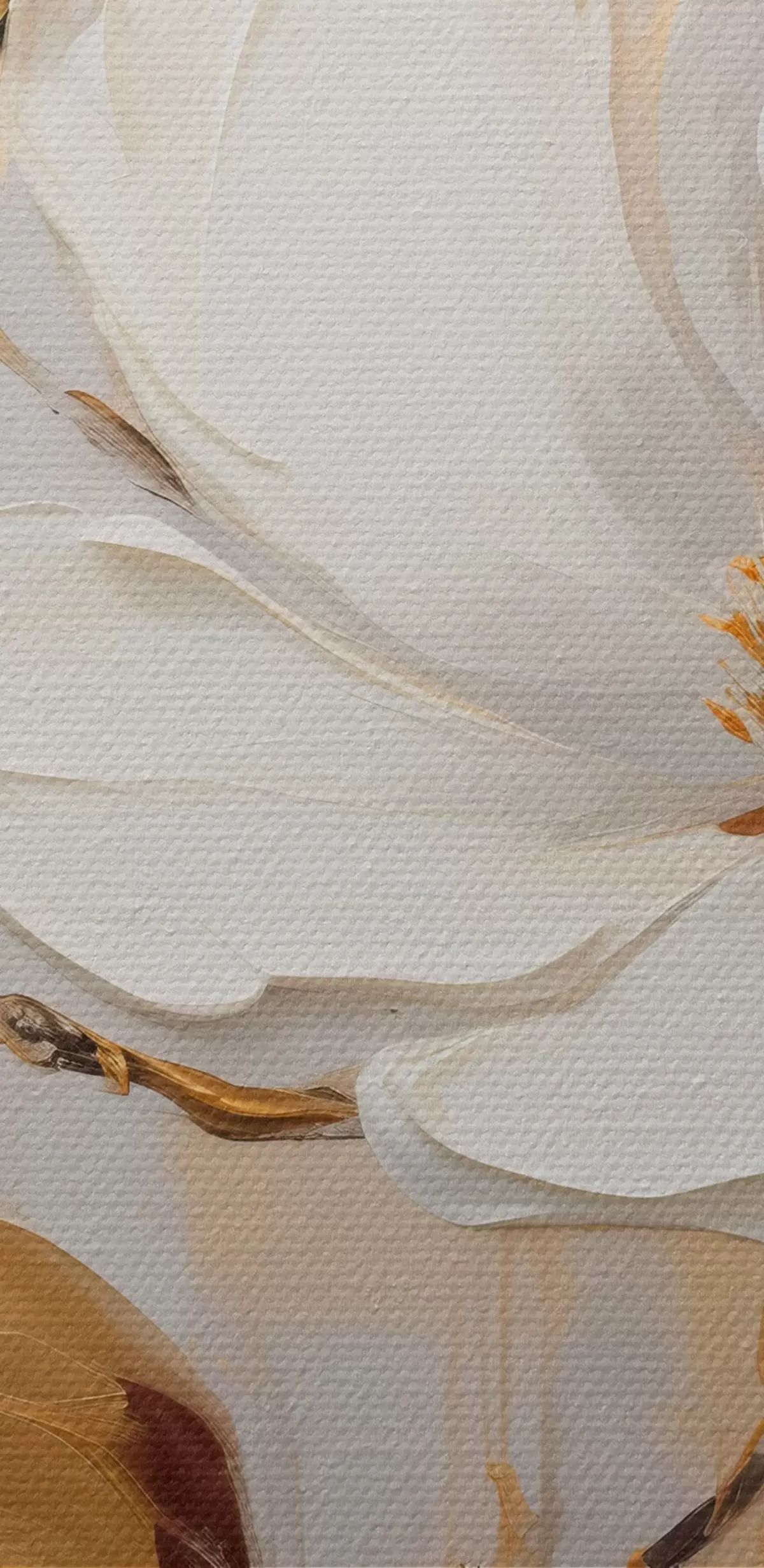 Obraz Dwa białe kwiaty z żółto-pomarańczowymi liśćmi na jasnym tle Nr m00687