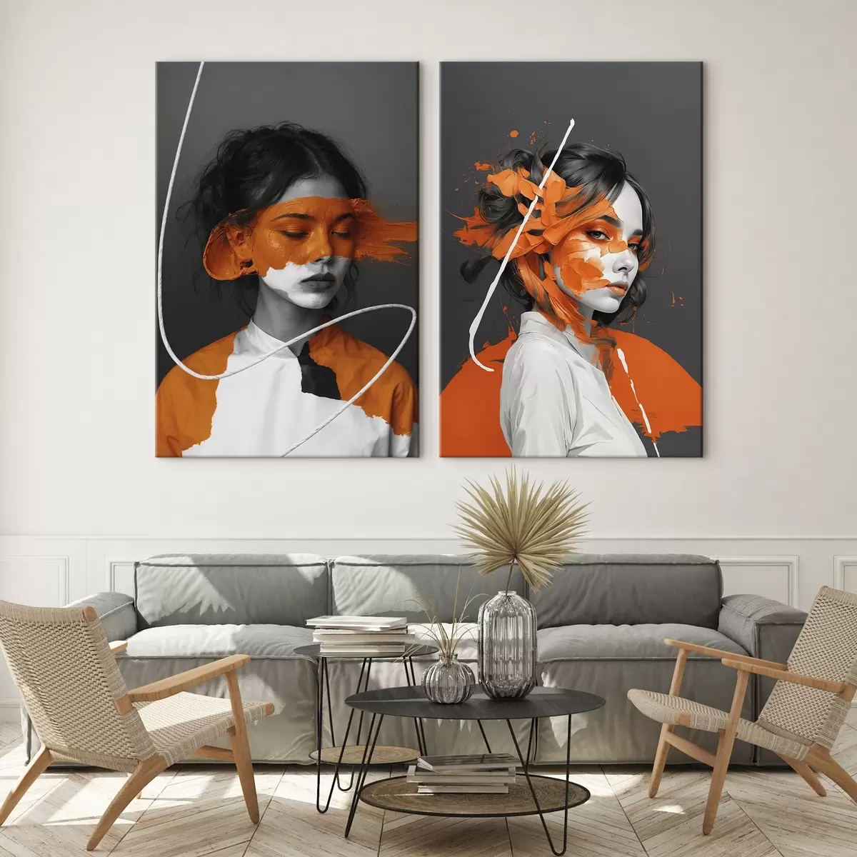 Obraz Portrety dziewcząt z abstrakcyjnymi pomarańczowymi pociągnięciami pędzla Nr m00693