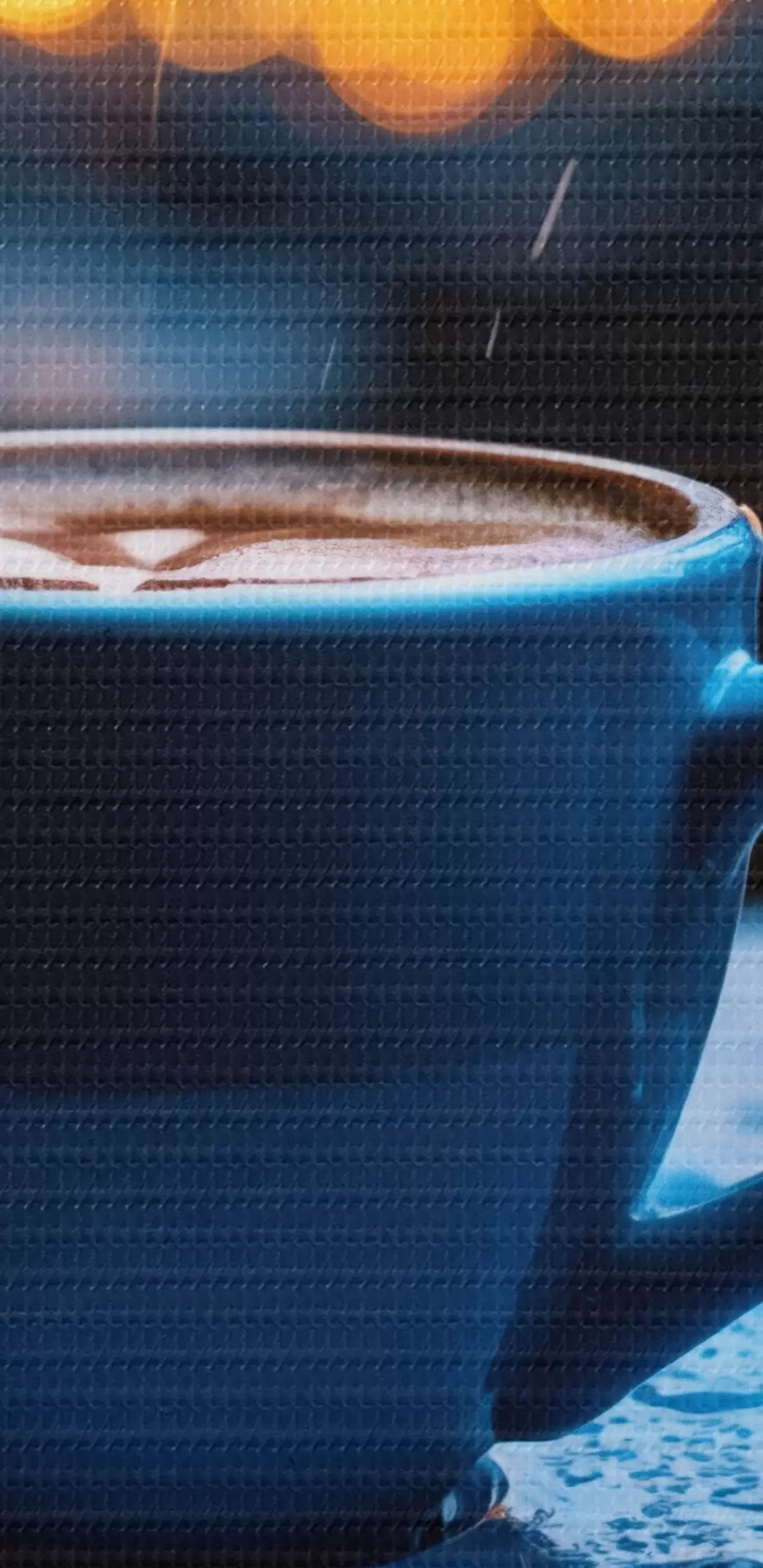 Obraz Niebieskie kwiaty z kroplami wody i filiżanka kawy w deszczu Nr m00694