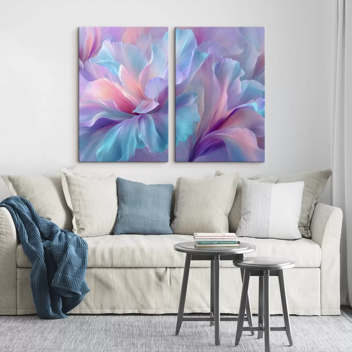 Obraz delikatne, fantazyjne kwiaty o płatkach w odcieniach fioletu, błękitu i różu. Nr m00700