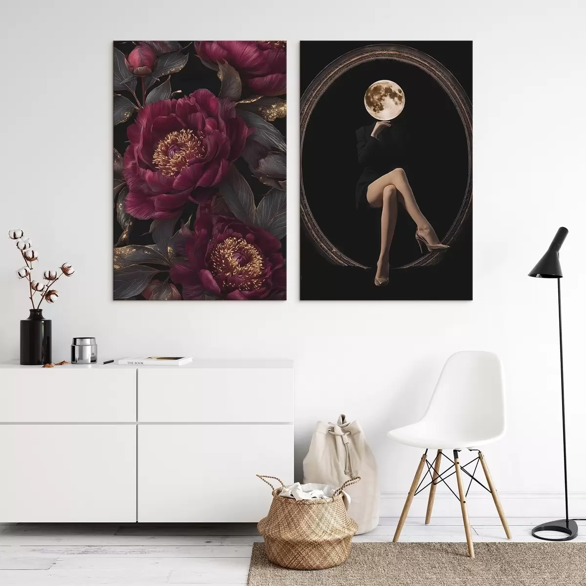 Obraz Burgundowe piwonie i sylwetka z głową w kształcie księżyca na czarnym tle Nr m00765