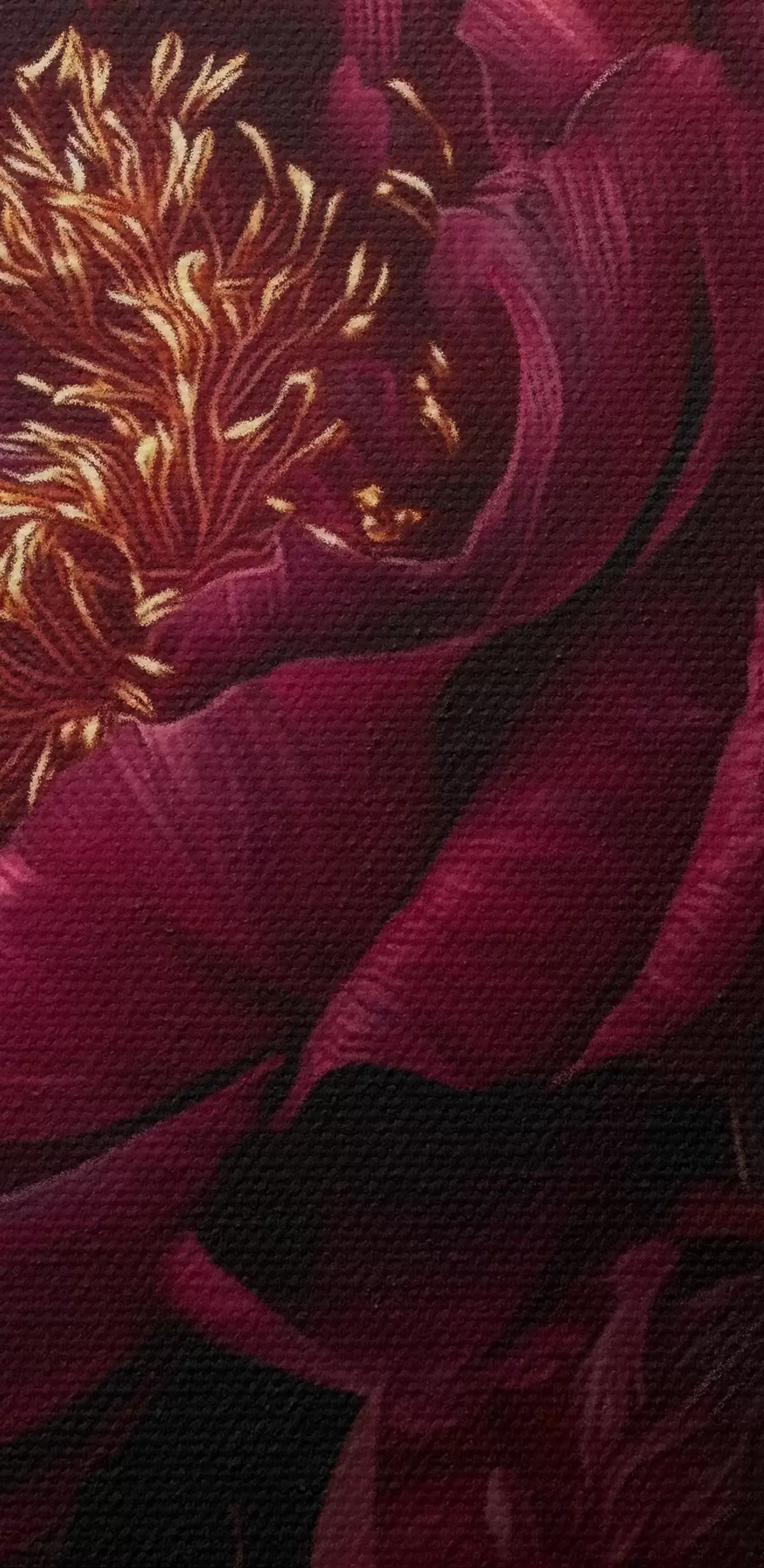 Obraz Burgundowe piwonie i sylwetka z głową w kształcie księżyca na czarnym tle Nr m00765