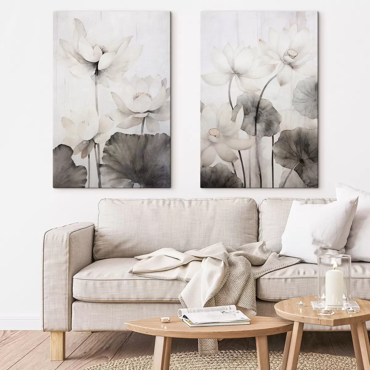 Obraz Białe teksturowane kwiaty lotosu z ciemnymi liśćmi, jasnym tłem i minimalistycznym wzorem Nr m00824