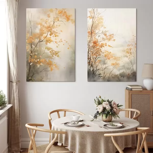 Obraz Jesienne drzewa z pomarańczowymi liśćmi i gałęziami, delikatna akwarela, subtelne pociągnięcia pędzla Nr m00826