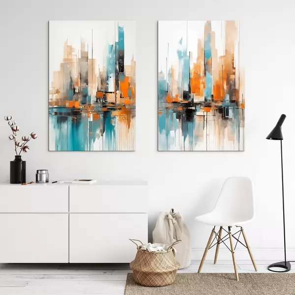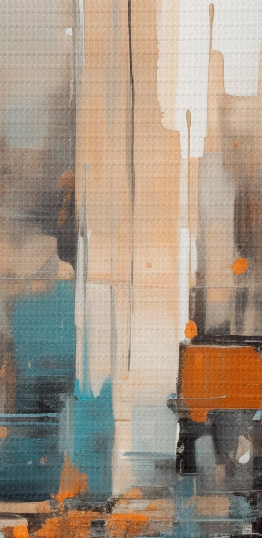 Obraz Abstrakcyjny pejzaż miejski z pionowymi pociągnięciami pędzla w odcieniach pomarańczowego, niebieskiego i białego, styl malarski Nr m00876