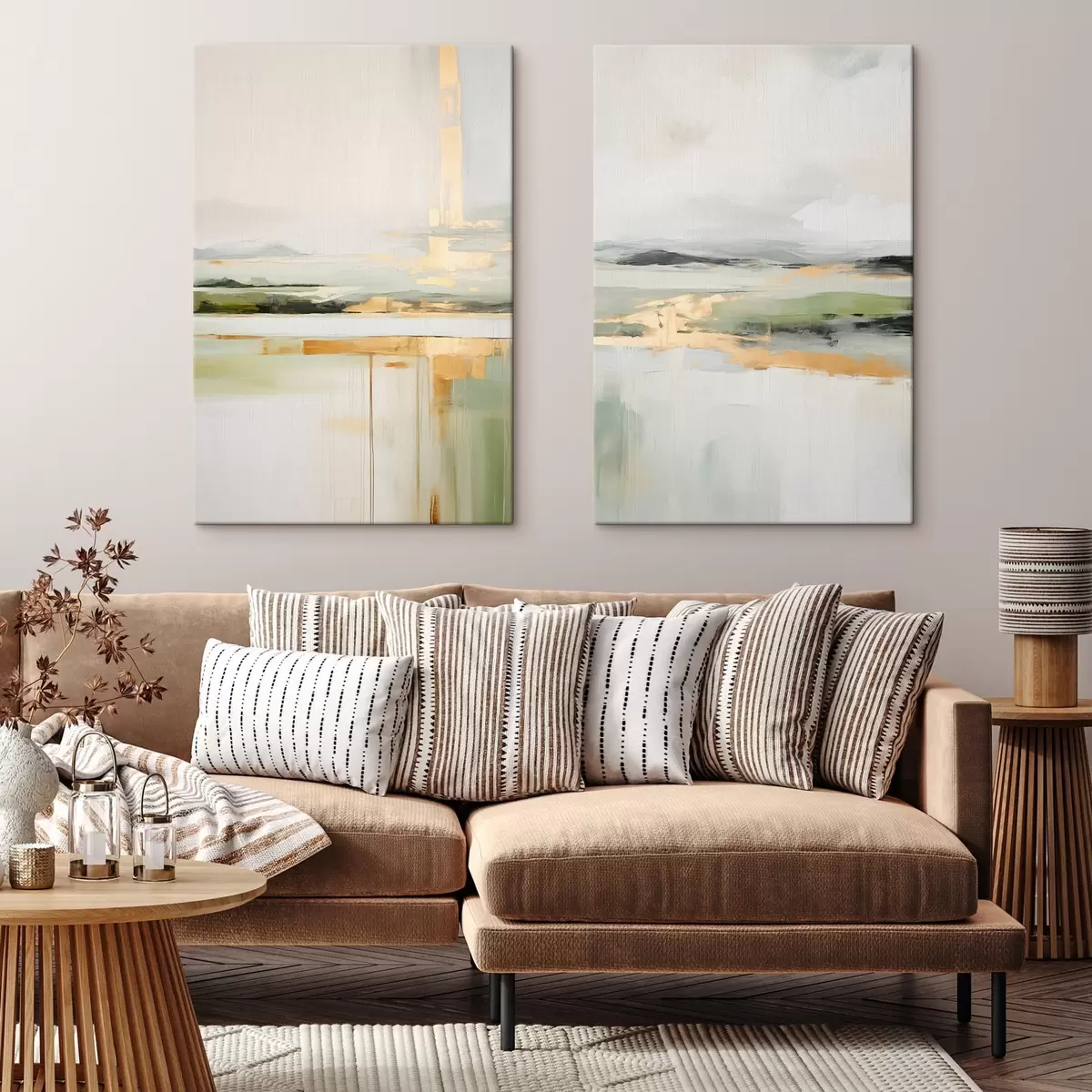Obraz Abstrakcyjny pejzaż z żółtymi akcentami, minimalistyczna kompozycja ziemi, wody i nieba, w stonowanej kolorystyce Nr m00877