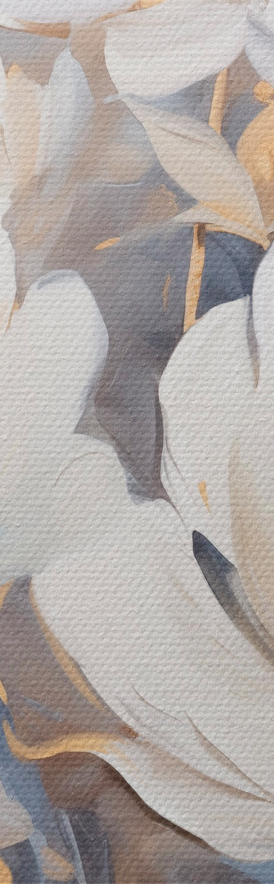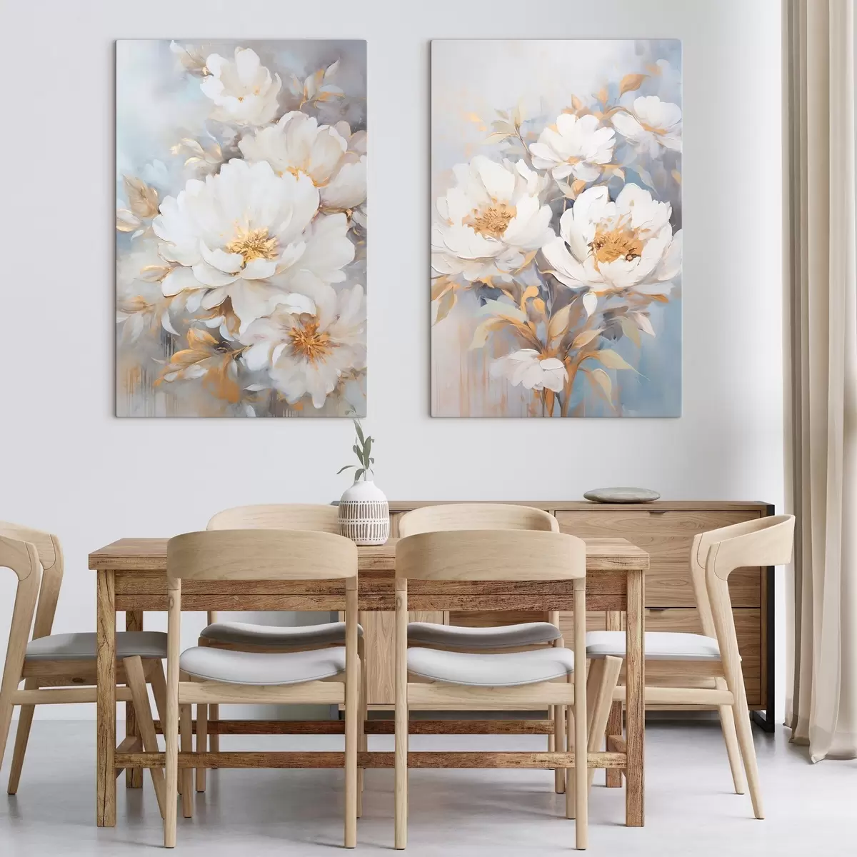 Obraz Białe piwonie z żółtymi środkami i liśćmi, delikatne pociągnięcia pędzla, jasnoniebieskie tło, kompozycja kwiatowa Nr m00878