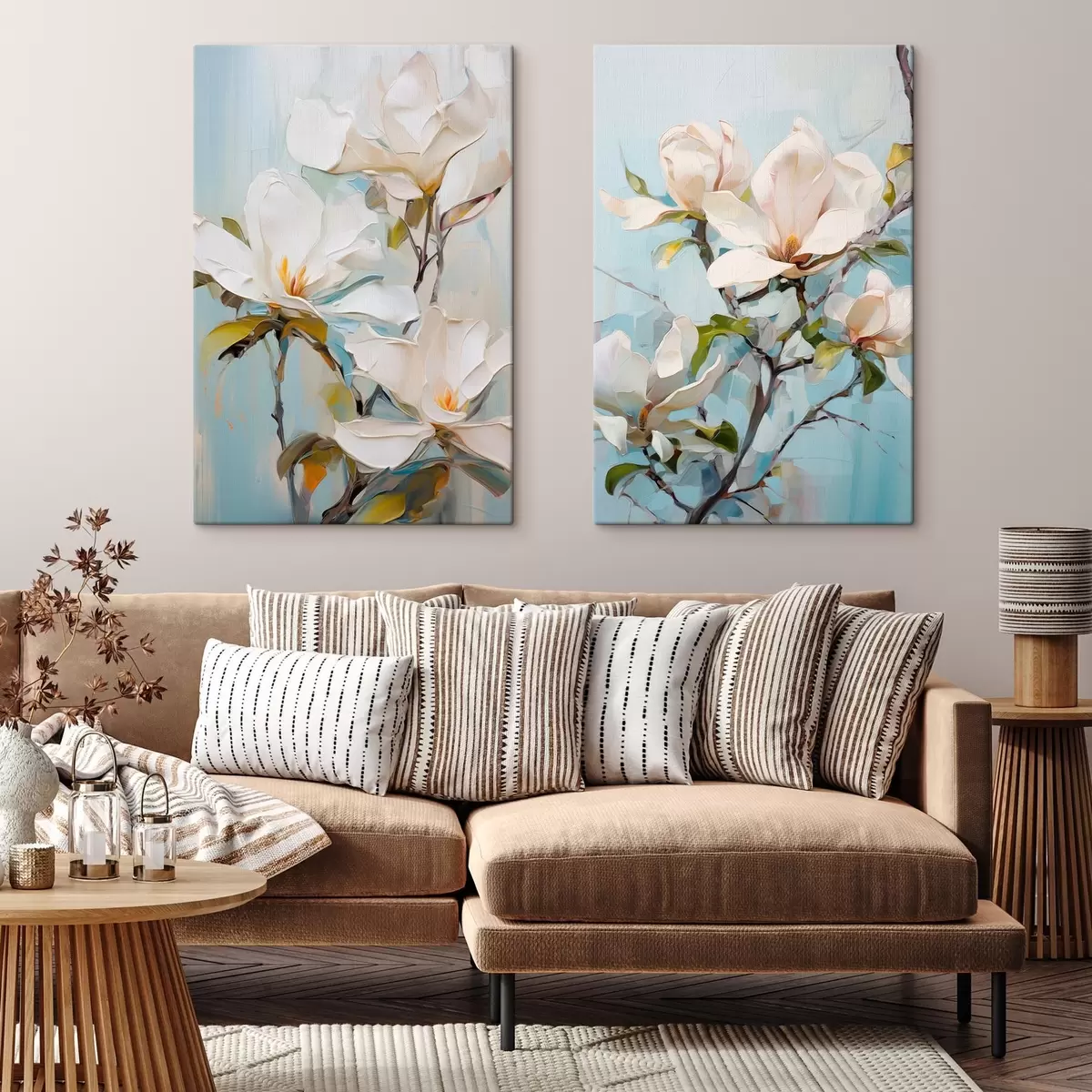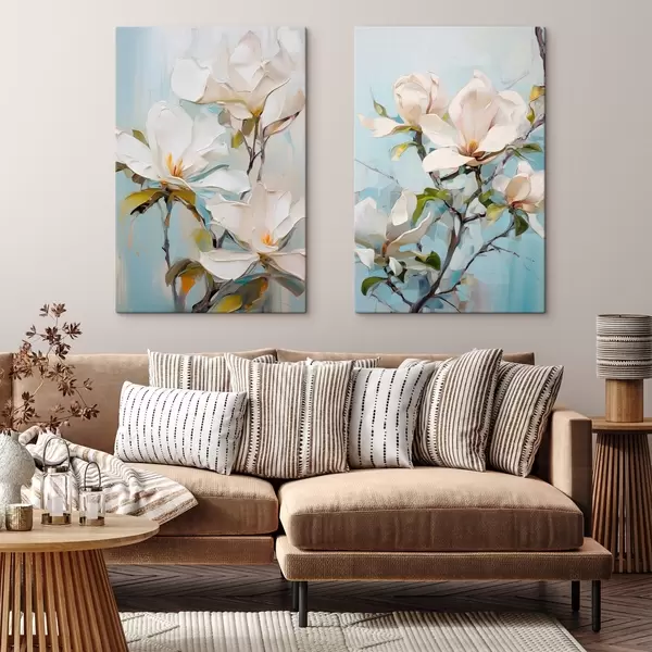 Obraz Białe kwiaty magnolii, jasnoniebieskie tło z delikatnymi pociągnięciami pędzla, styl malarstwa olejnego, faktura impasto Nr m00881