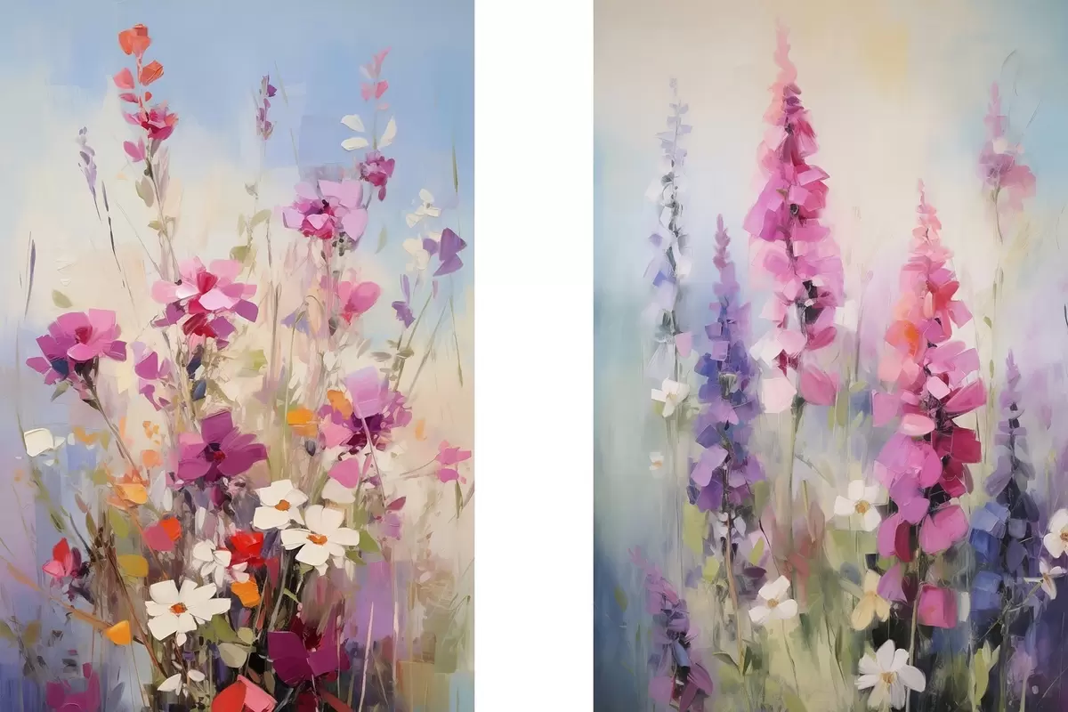 Obraz Żywe kwiaty z białymi stokrotkami na polu, delikatne pociągnięcia pędzla, pastelowe kolory, styl impresjonistyczny Nr m00882