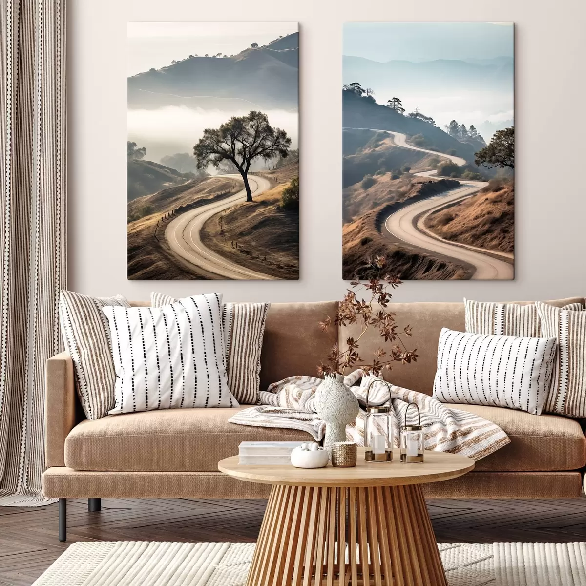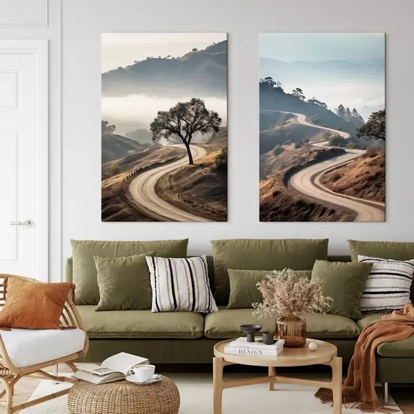 Obraz Kręta droga przez pagórkowaty krajobraz z suchą trawą pod czystym niebem, z górami w oddali Nr m00887