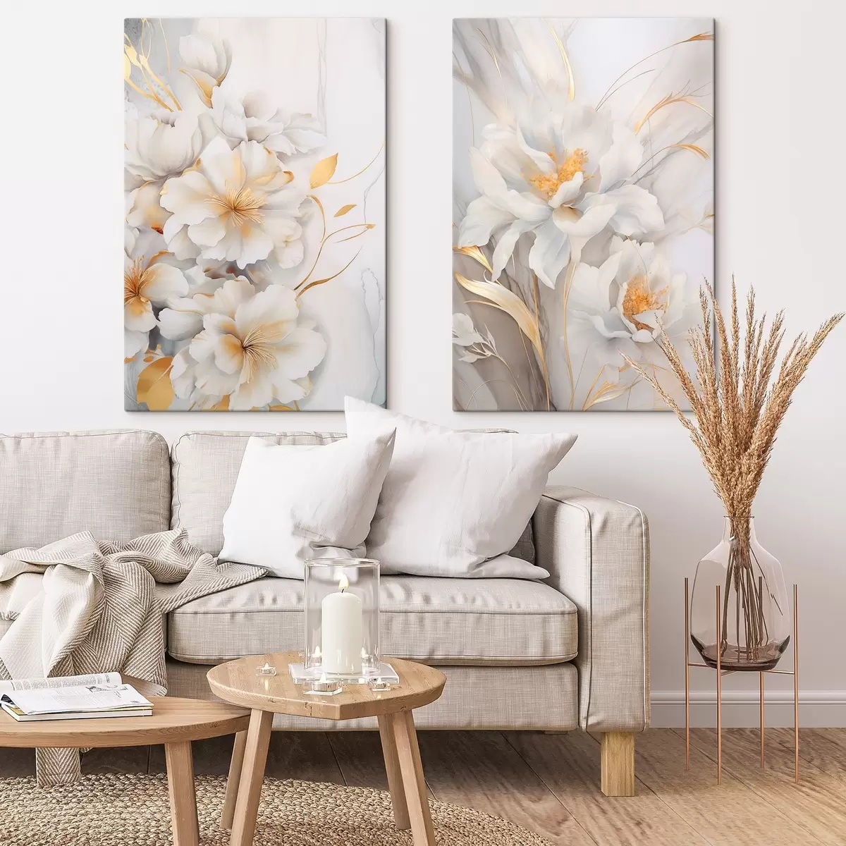 Obraz Białe kwiaty z żółtymi detalami, płatki z delikatnymi cieniami, jasne tło z subtelnym efektem marmuru Nr m00889