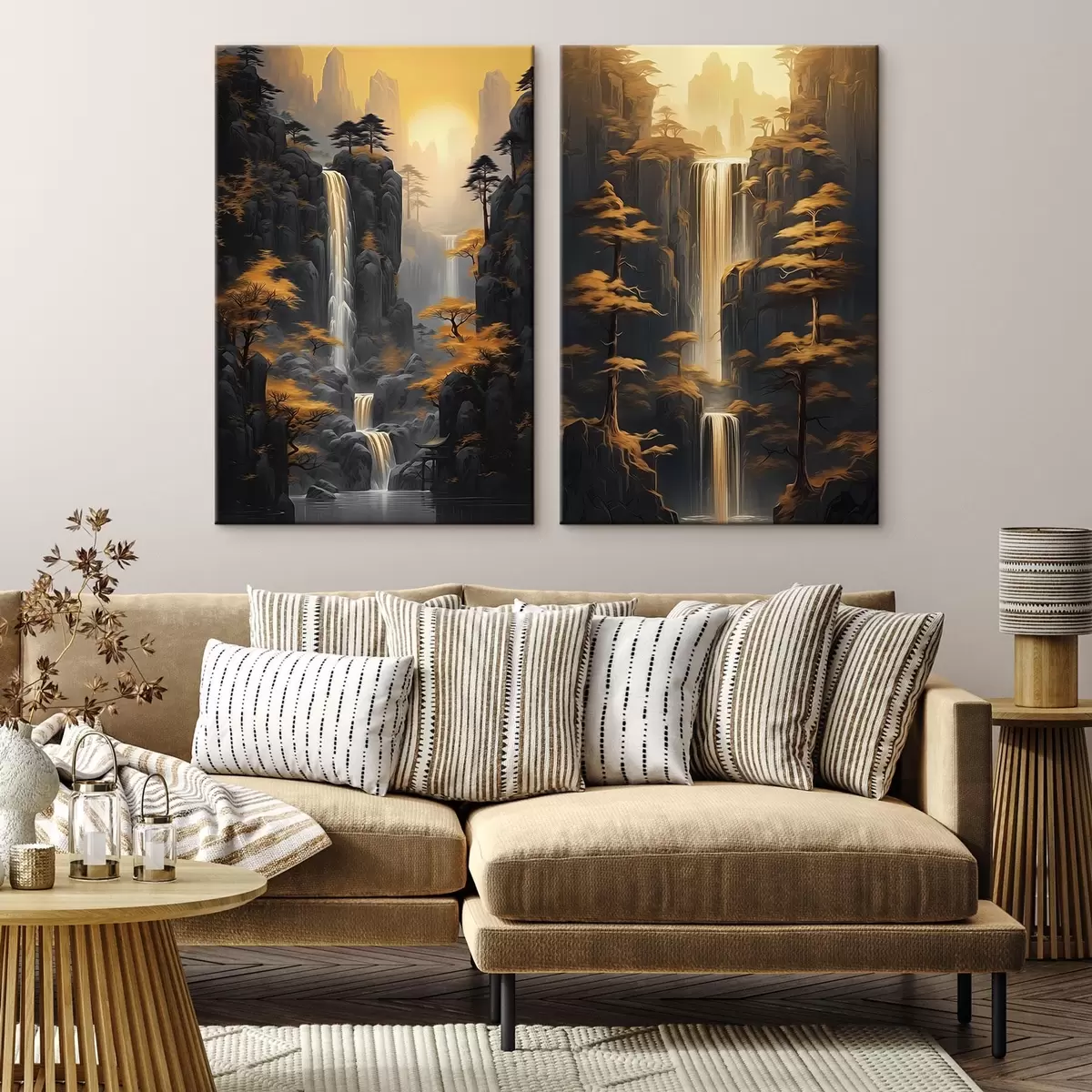 Obraz Krajobraz z wodospadem i górami w złocistym świetle Nr m00928