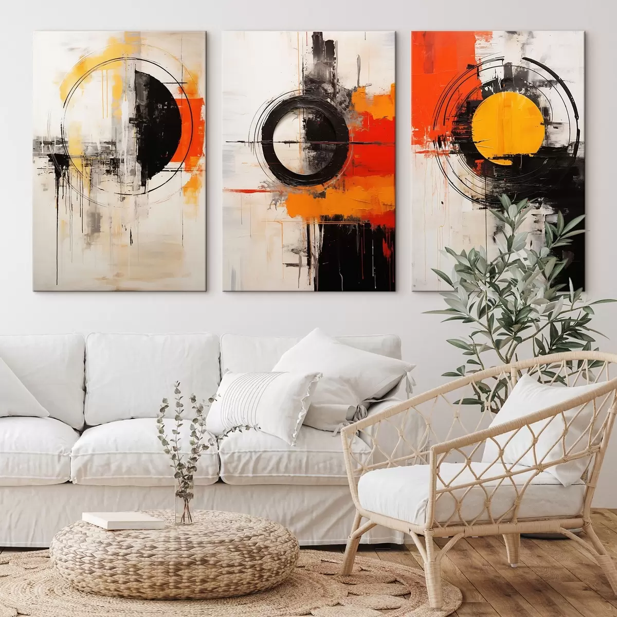 Obraz Teksturowane koła i odważne pociągnięcia pędzlem w kolorach czarnym, ochry i pomarańczowym. Nr m00974