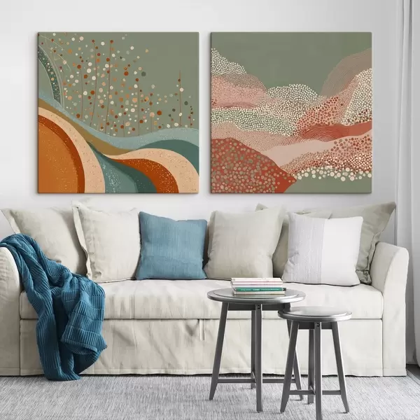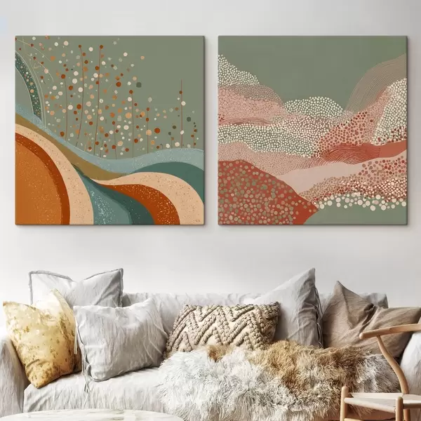 Obraz Dwuczęściowy abstrakcyjny pejzaż z kropkowanymi i falistymi elementami Nr m00987