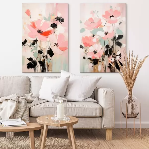 Obraz Różowe i czarne kwiaty z liśćmi, delikatne pastelowe kolory, abstrakcyjna kompozycja kwiatowa, minimalistyczna sztuka Nr m01004