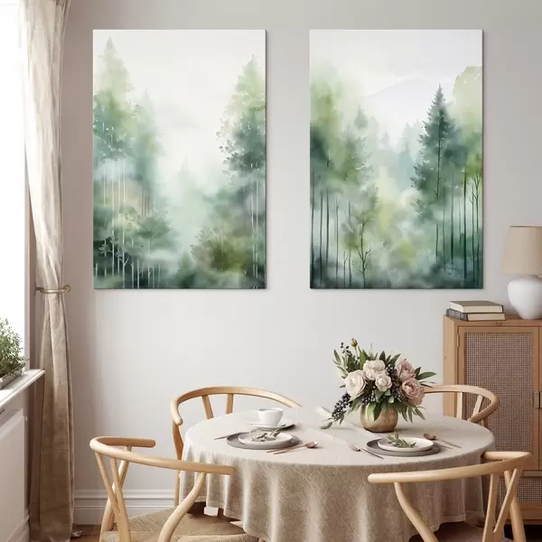 Obraz Akwarelowa imitacja abstrakcyjnego lasu z wysokimi drzewami i zielonymi liśćmi, w delikatnych, stonowanych kolorach. Nr m01005