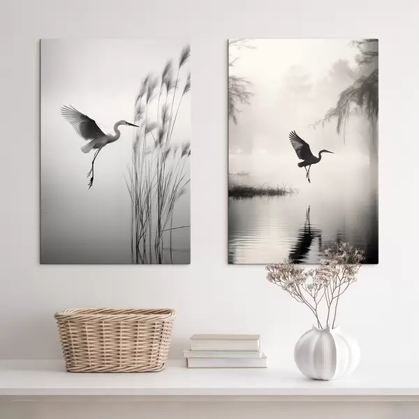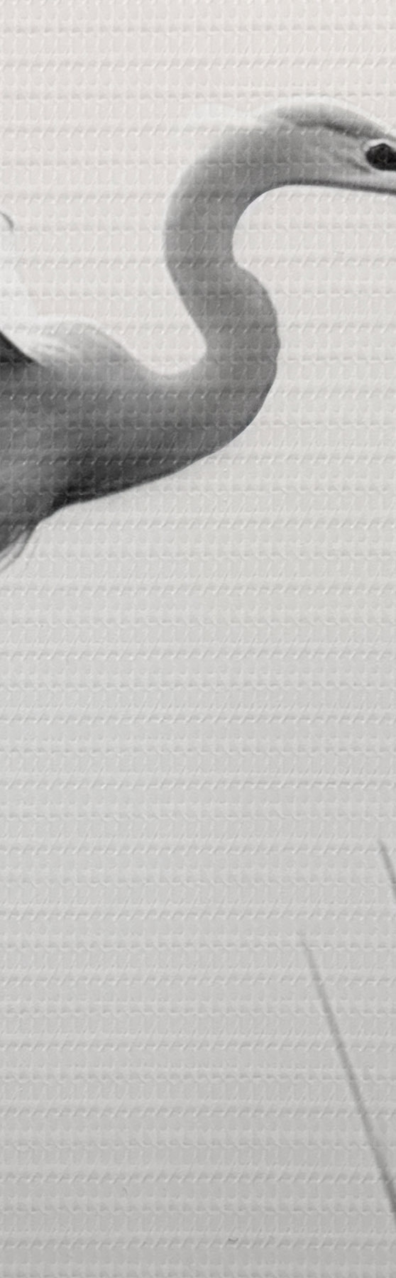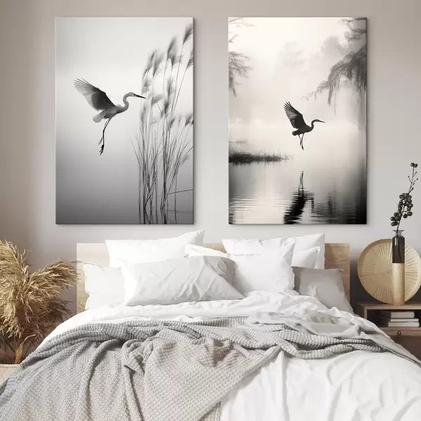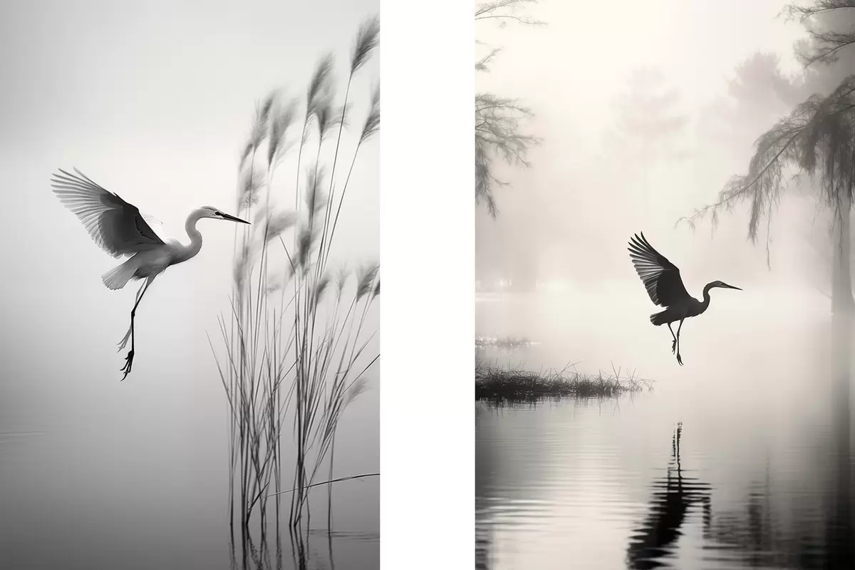 Obraz Biała czapla z rozpostartymi skrzydłami, latająca w pobliżu wysokich trzcin, czarno-biała minimalistyczna kompozycja Nr m01007