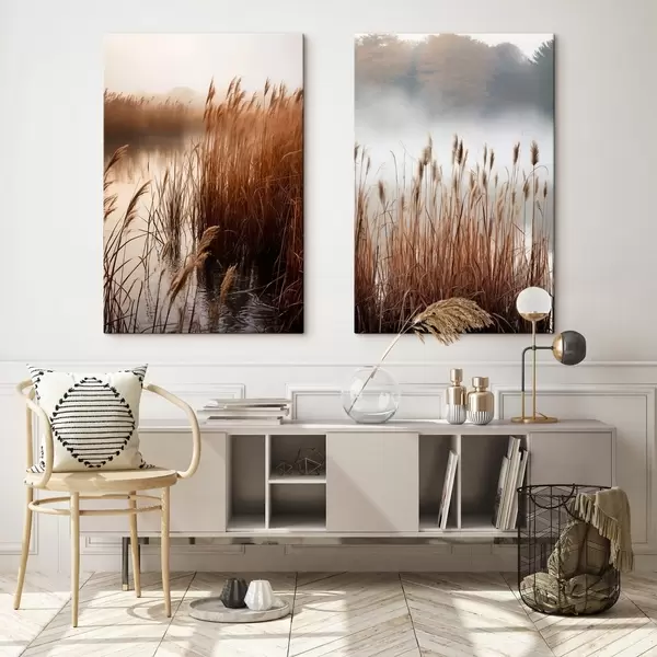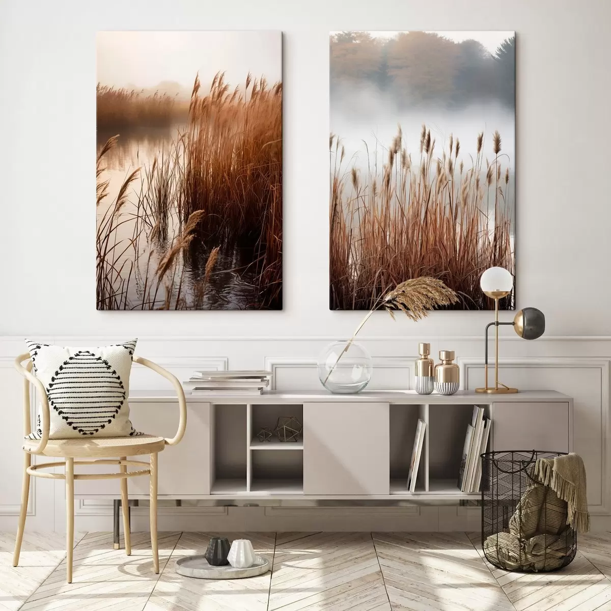 Obraz Wysokie trzciny rosnące w zbiorniku wodnym, woda odbija trzciny, mgliste tło, miękkie światło, scena natury Nr m01008