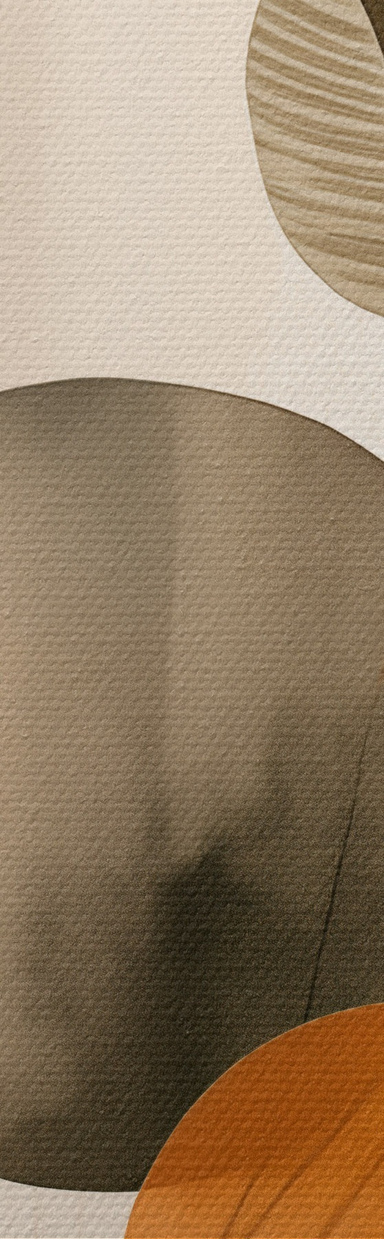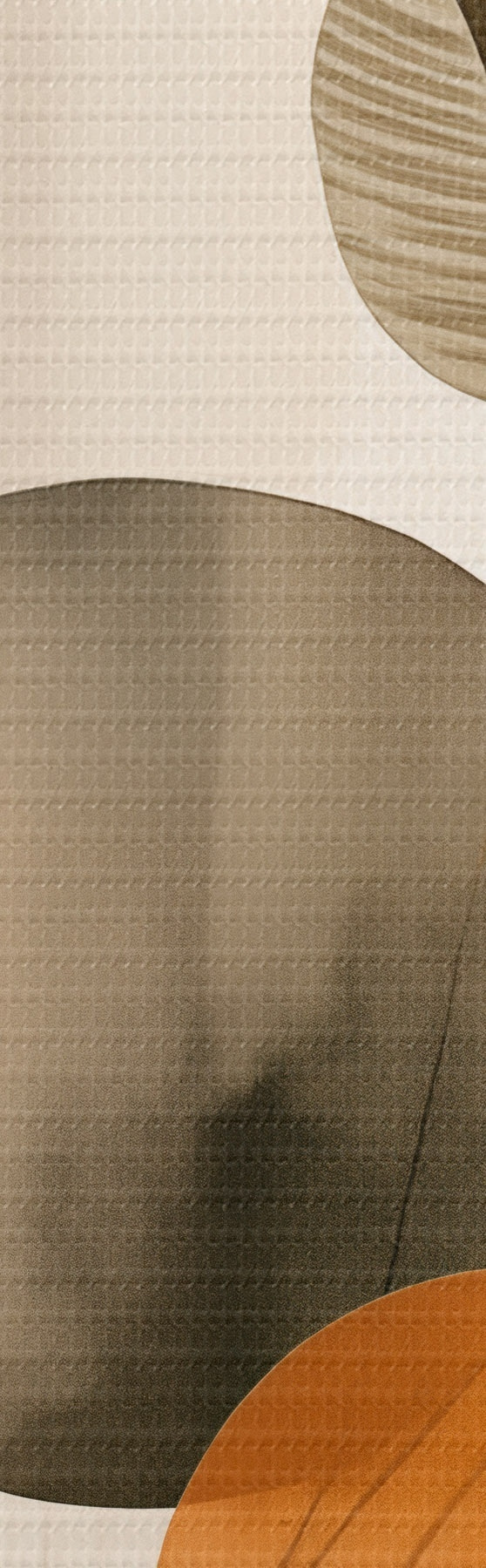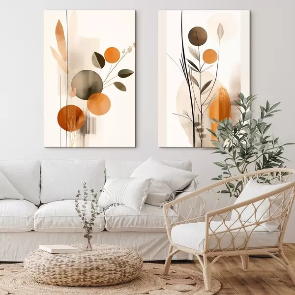Obraz Imitacja malarstwa abstrakcyjnego z pomarańczowymi i szarymi okręgami, liśćmi i gałęziami, styl nowoczesny, efekt akwareli Nr m01009