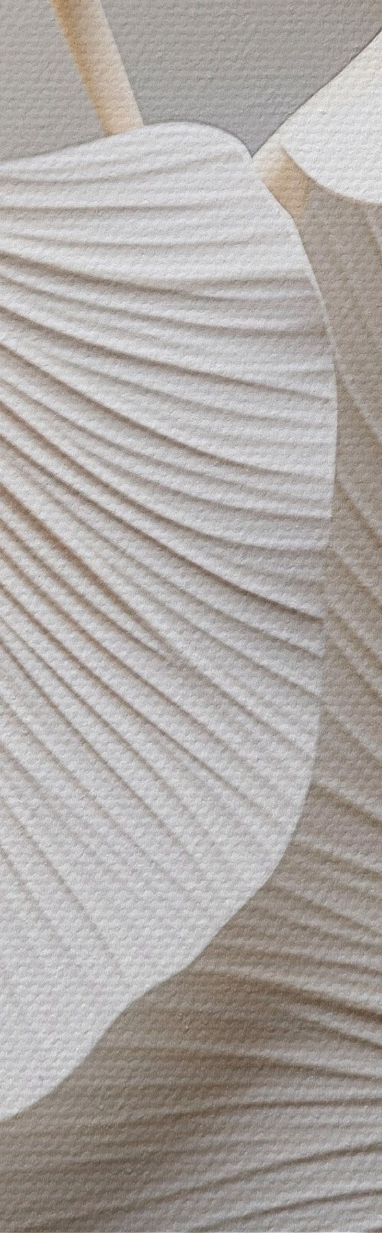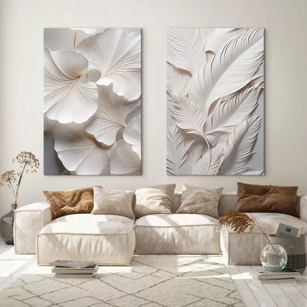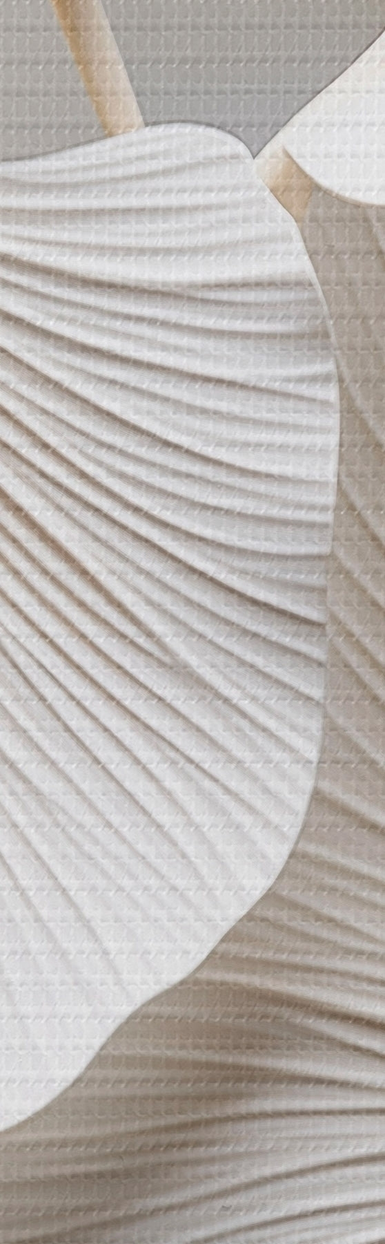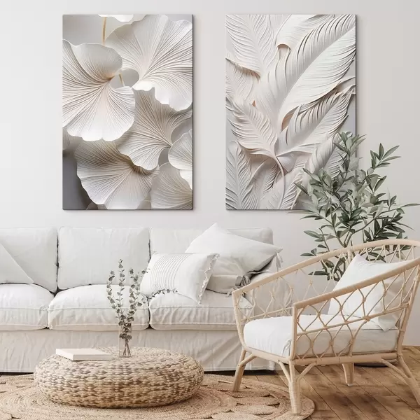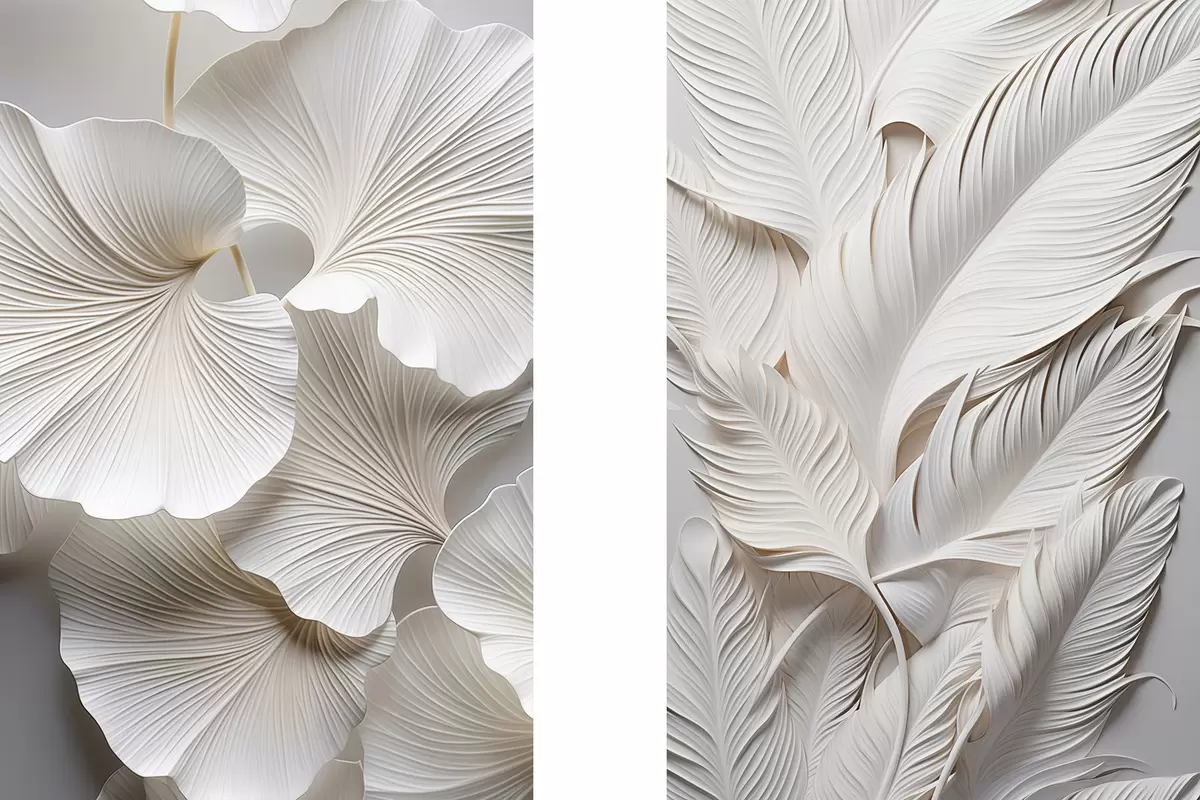 Obraz Białe liście miłorzębu i długie liście o skomplikowanych szczegółach, tworzące efekt tekstury i warstwowości, minimalistyczna sztuka. Nr m01013