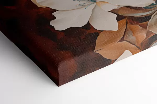 Obraz Abstrakcyjne białe kwiaty i liście na tle brązowym i niebieskim z abstrakcyjnymi kształtami, w minimalistycznym stylu. Nr m01015
