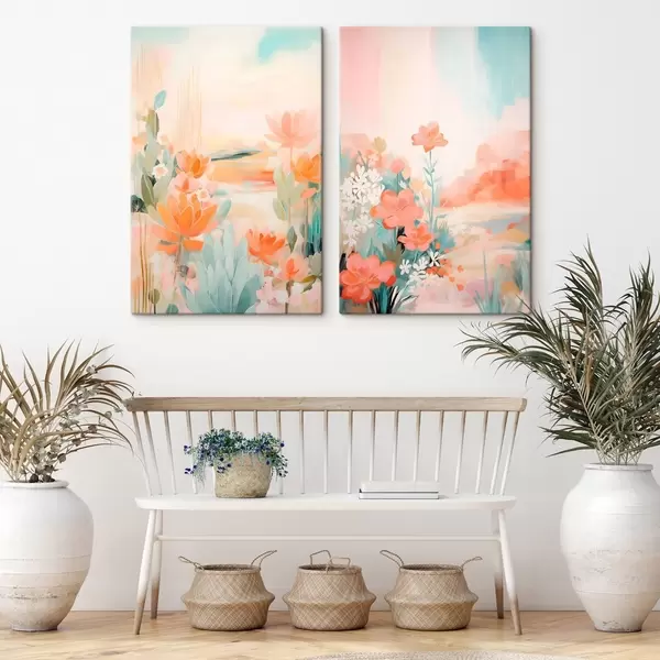 Obraz Motywy kwiatowe w pastelowych odcieniach na tle lekko zamglonej doliny Nr m01085