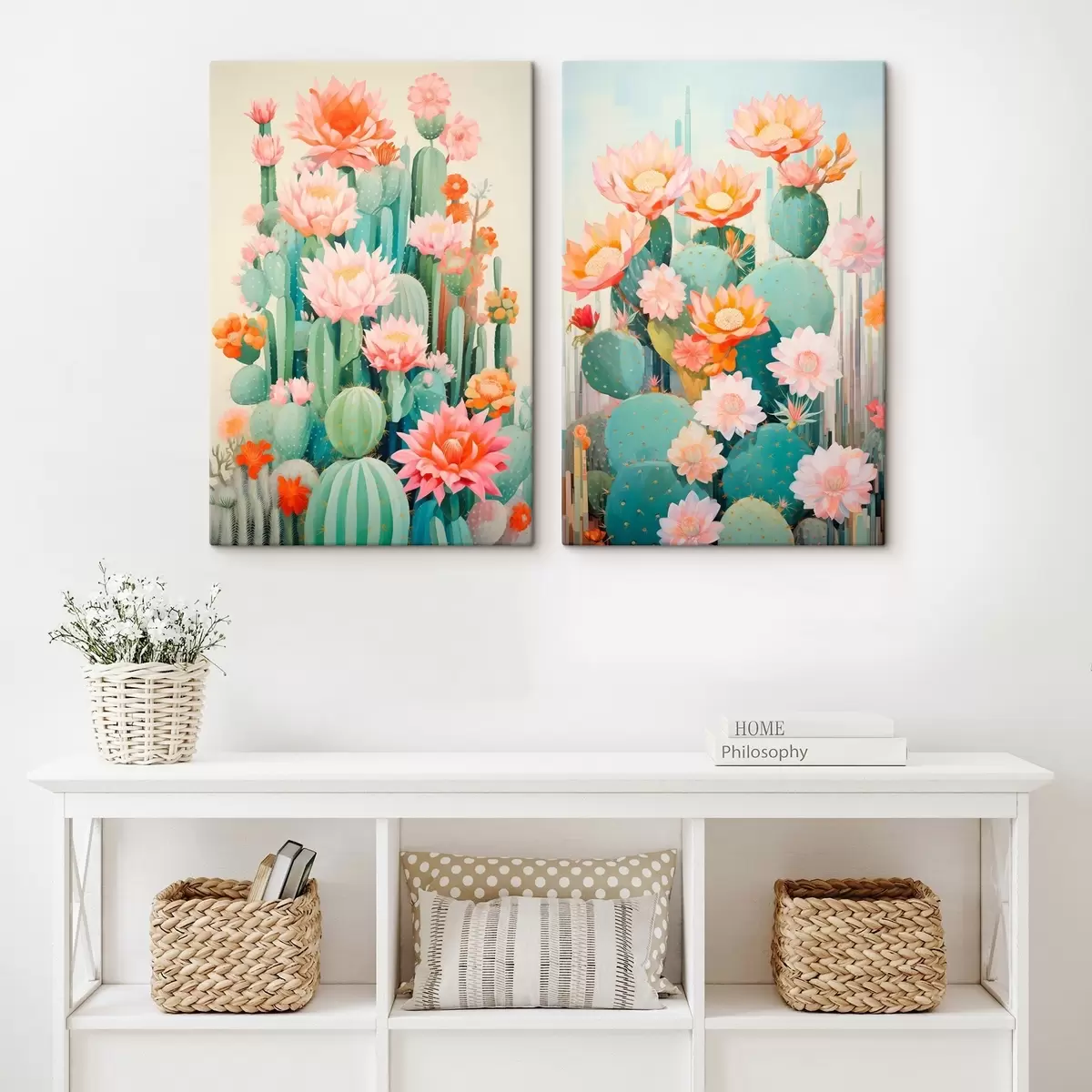 Obraz Kaktusy o dużych kwiatach, pastelowa paleta barw i poczucie spokoju Nr m01086