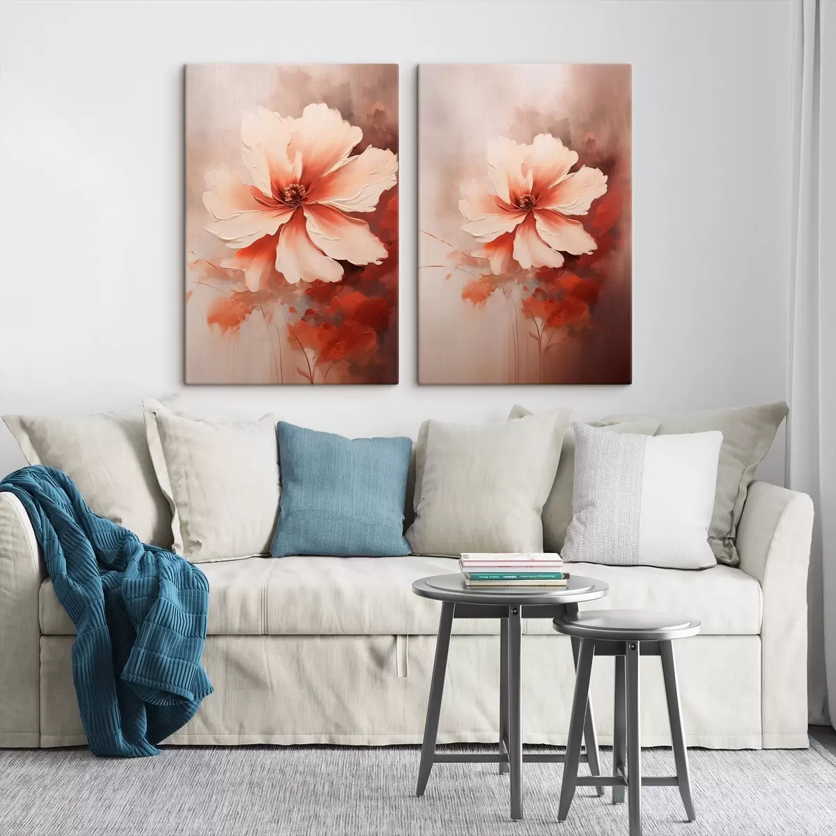 Obraz Kompozycja kwiatowa: białe i kremowe płatki, akcenty w kolorze koralowym oraz delikatne, zamglone tło. Nr m01088