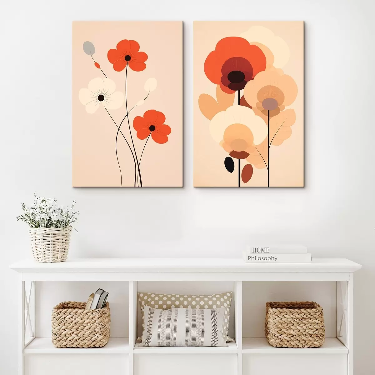 Obraz Minimalistyczny dyptyk kwiatowy w ciepłych odcieniach beżu i koralowca z graficznymi liniami Nr m01090