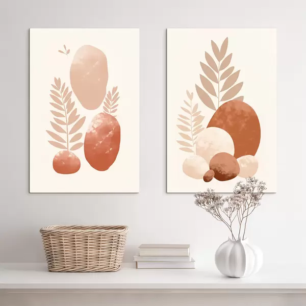 Obraz Abstrakcyjne kształty, kamienie o fakturze i liście w stonowanych odcieniach brzoskwini i terakoty, minimalistyczne, kremowe tło. Nr m01114