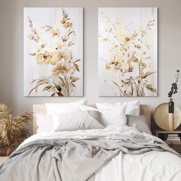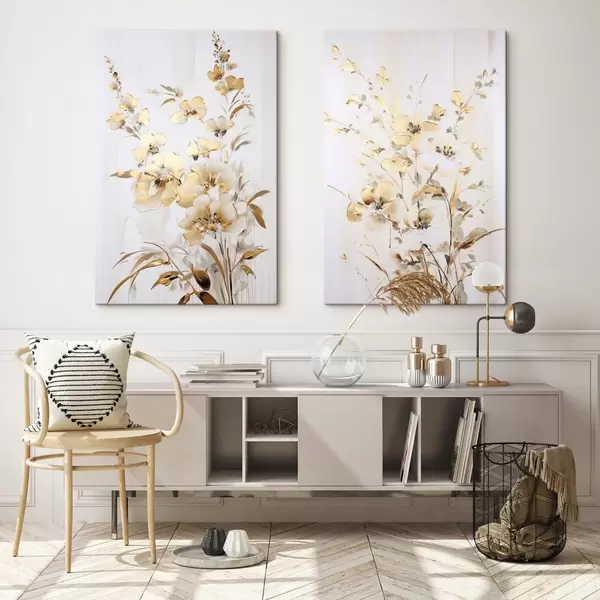 Obraz Teksturowane żółte kwiaty i liście na białym tle, z delikatnymi pociągnięciami pędzla Nr m01116