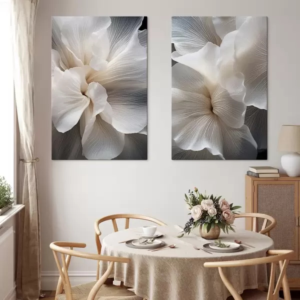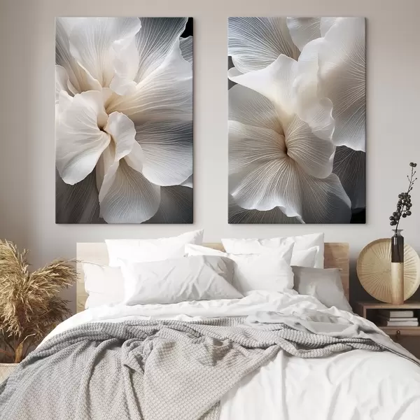 Obraz Zbliżenie na delikatne, abstrakcyjne białe płatki kwiatów o skomplikowanych liniach i zamazanym ciemnym tle. Nr m01117