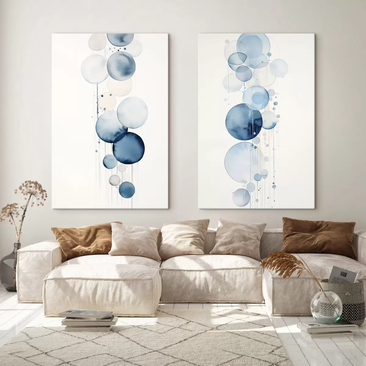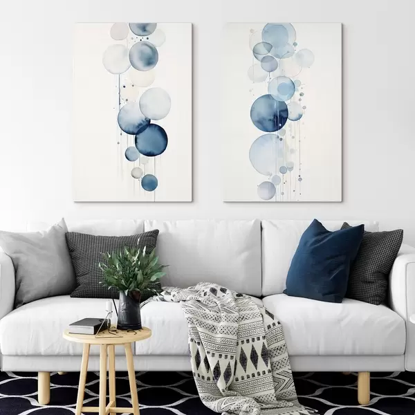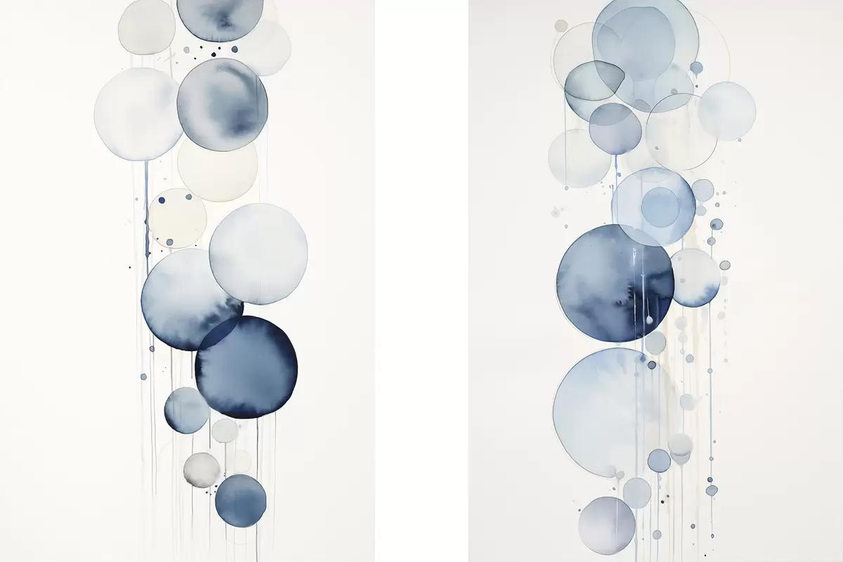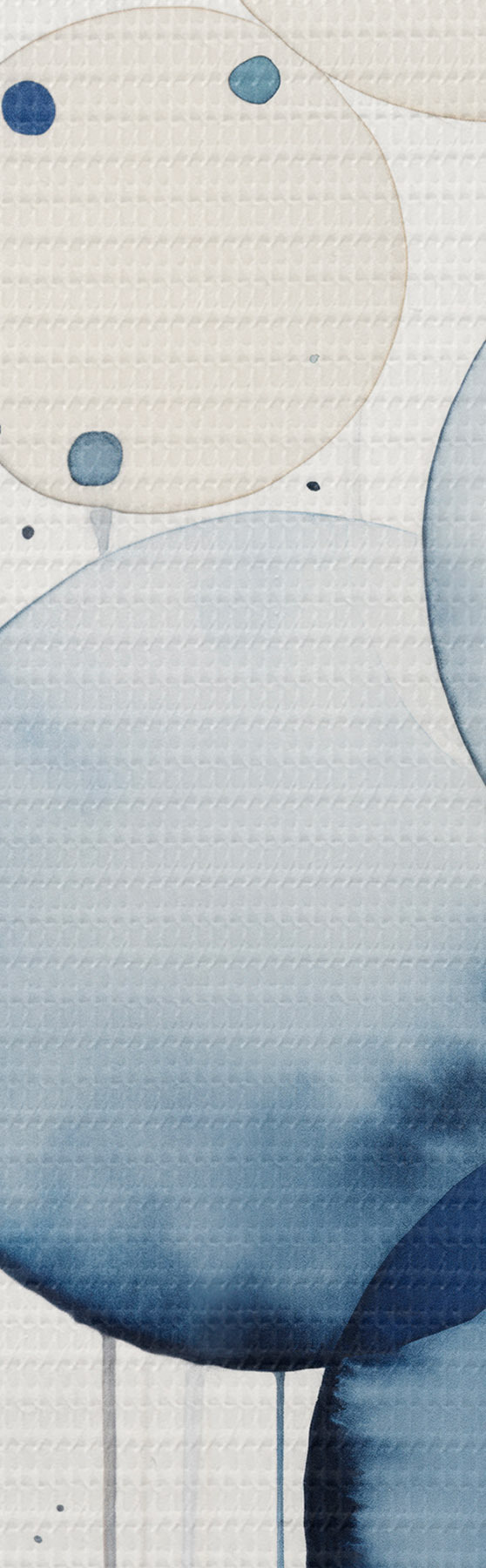 Obraz Abstrakcyjne, teksturowane niebiesko-białe koła o różnych rozmiarach, namalowane akwarelą na białym tle. Nr m01118